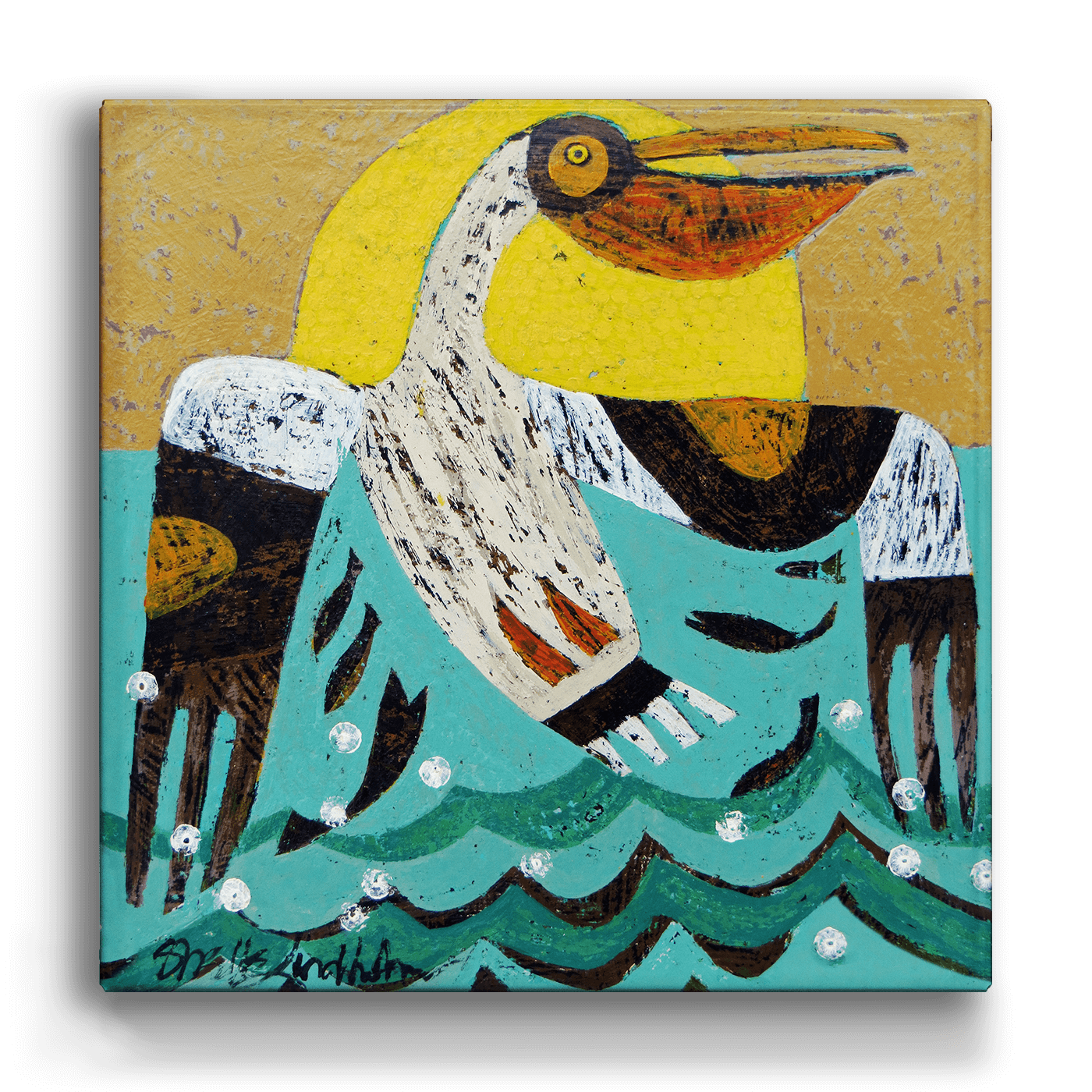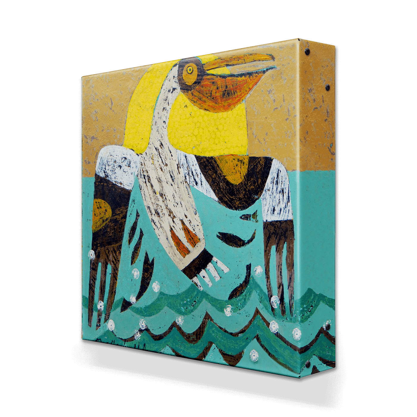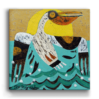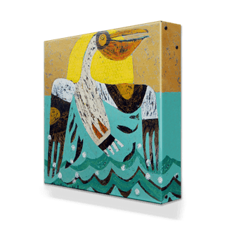 This vibrant artwork features a stylized pelican set against a backdrop of an abstract beach and a warm sky. The bold, textured brushstrokes and contrasting colors give the piece a lively and dynamic feel, capturing the essence of coastal life. The pelican, depicted with a large beak and expressive eye, adds a whimsical touch to the composition, making it a perfect addition to any space that needs a pop of color and personality. Display by itself or with its companion pieces.