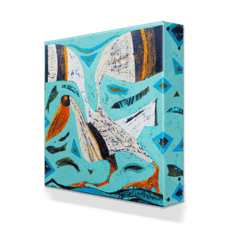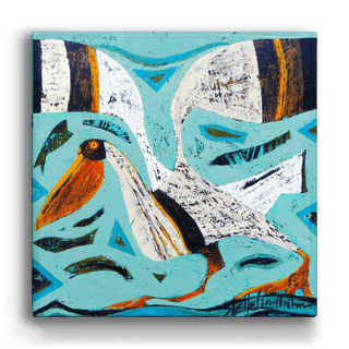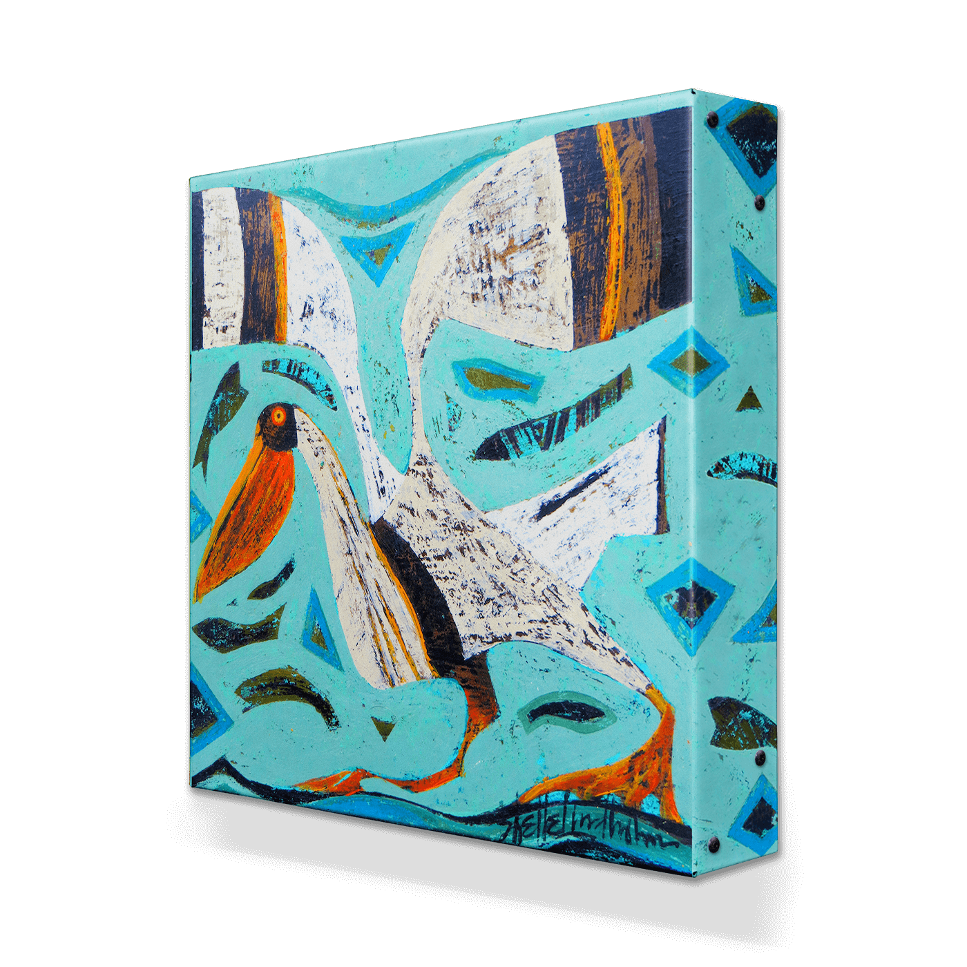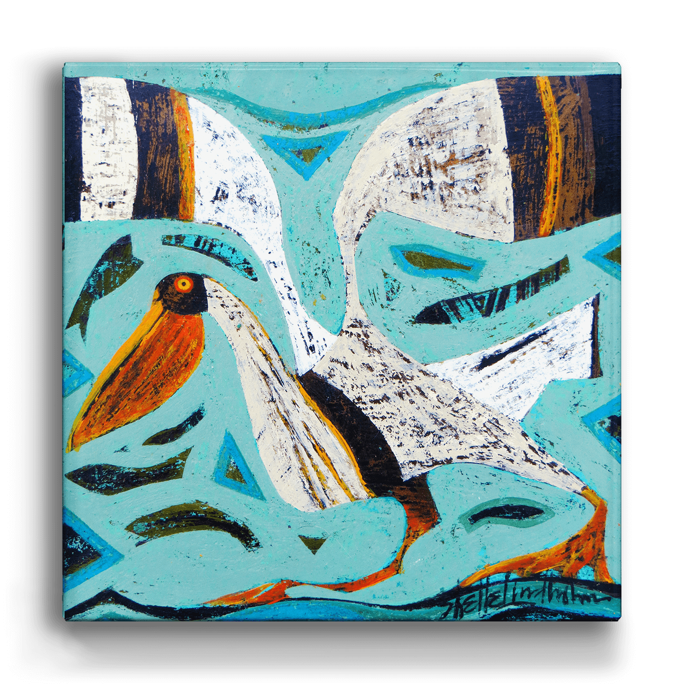 This vibrant artwork features a stylized pelican set against a backdrop of an abstract beach and a warm sky. The bold, textured brushstrokes and contrasting colors give the piece a lively and dynamic feel, capturing the essence of coastal life. The pelican, depicted with a large beak and expressive eye, adds a whimsical touch to the composition, making it a perfect addition to any space that needs a pop of color and personality. Display by itself or with its companion pieces.