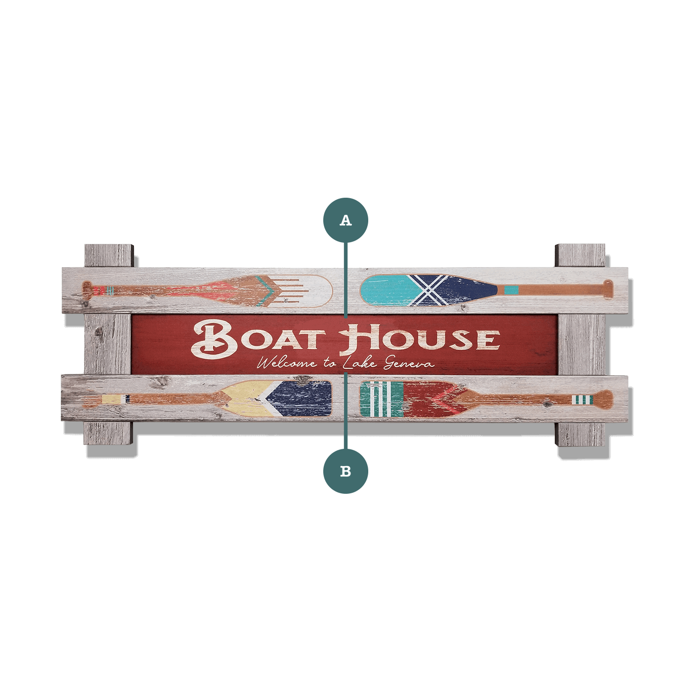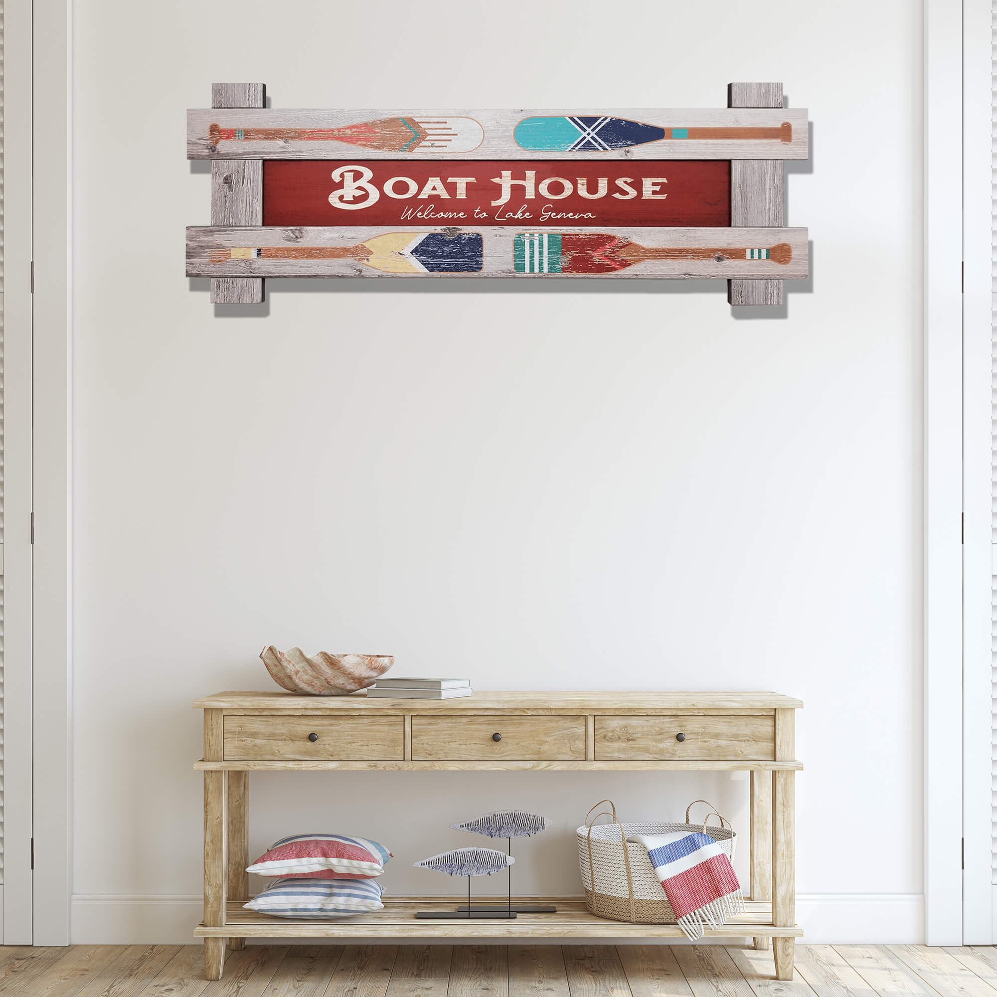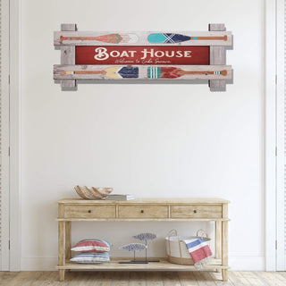 Immerse yourself in the rustic allure of lakeside living with this charming Boat House sign. Crafted with a keen eye for detail, the sign features an array of painted oars in soft, weathered hues, symbolizing the simple pleasures of rowing through calm waters.
