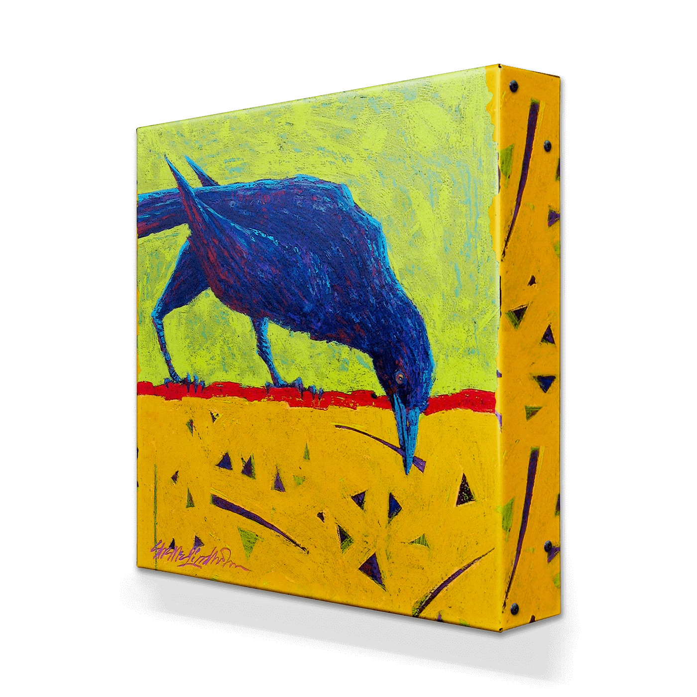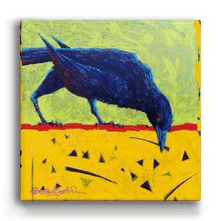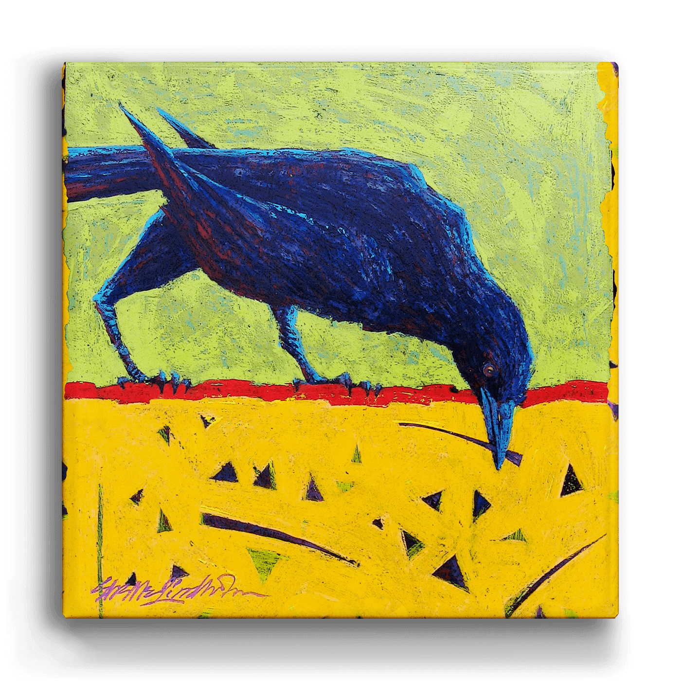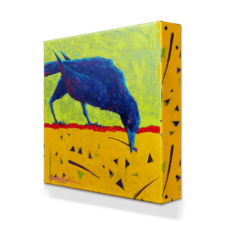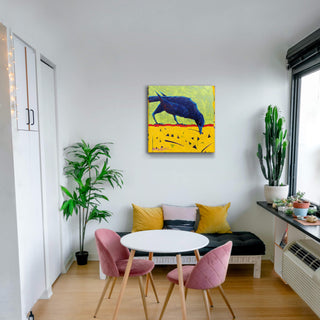 This bold artwork features a curious crow in striking deep blue hues, perched against a vivid lime-green and golden-yellow background. The textured brushstrokes and dynamic color contrasts bring energy and personality to the composition, while the geometric shapes below add an element of the abstract. A celebration of nature's simple yet captivating moments, this piece is perfect for adding a vibrant and playful touch to any space.