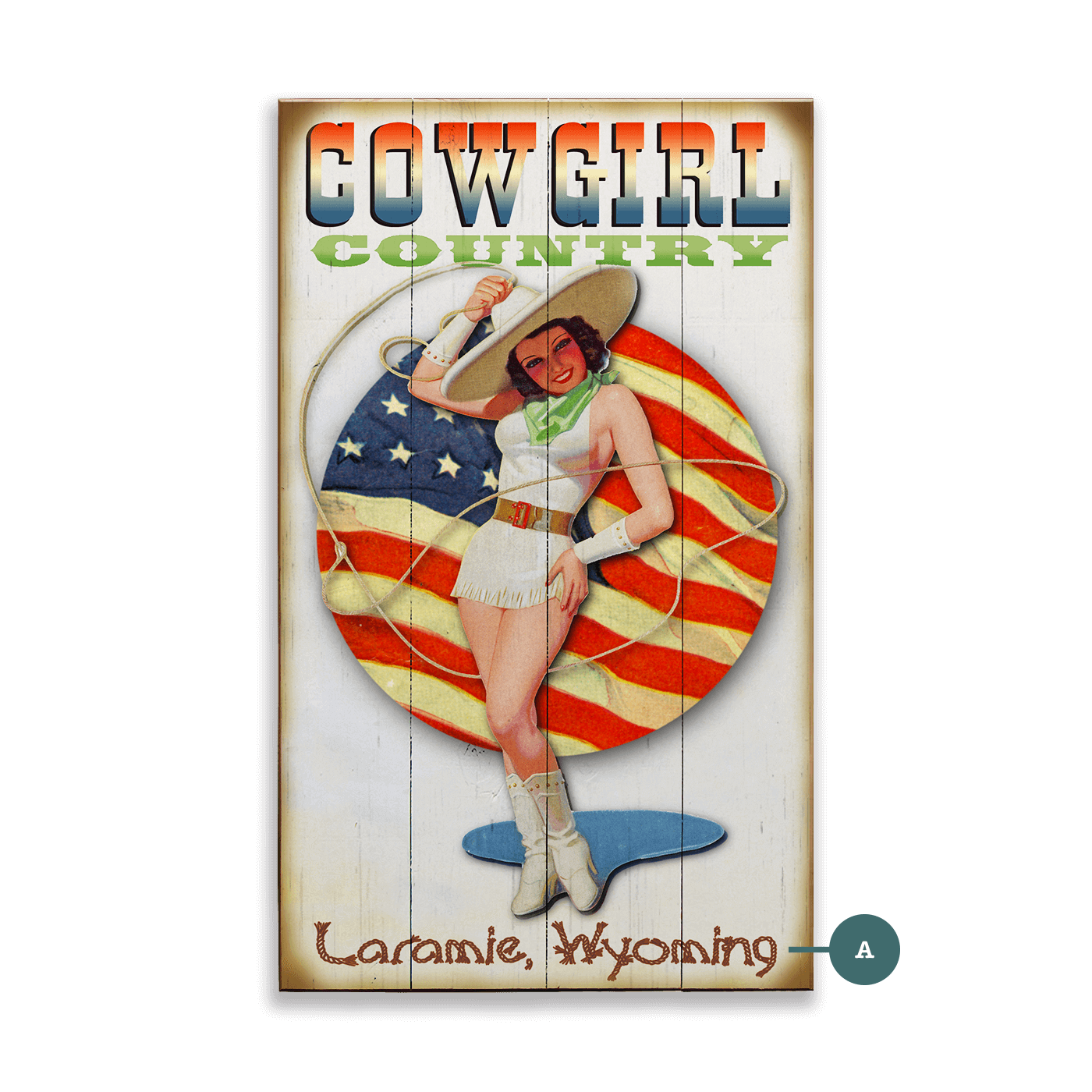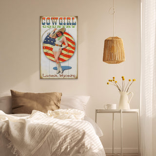 This artwork celebrates the bold and spirited essence of cowgirl culture with a striking depiction of a confident western pin-up girl posing with her lasso. Set against a patriotic American flag backdrop, the image blends classic western themes with a touch of retro charm. The distressed edges and bold typography enhance its nostalgic appeal, making it a perfect piece for those who appreciate rodeo heritage, country living, or vintage Americana. Ideal for rustic decor, ranch settings, or spaces that embrace the independent spirit of the West.