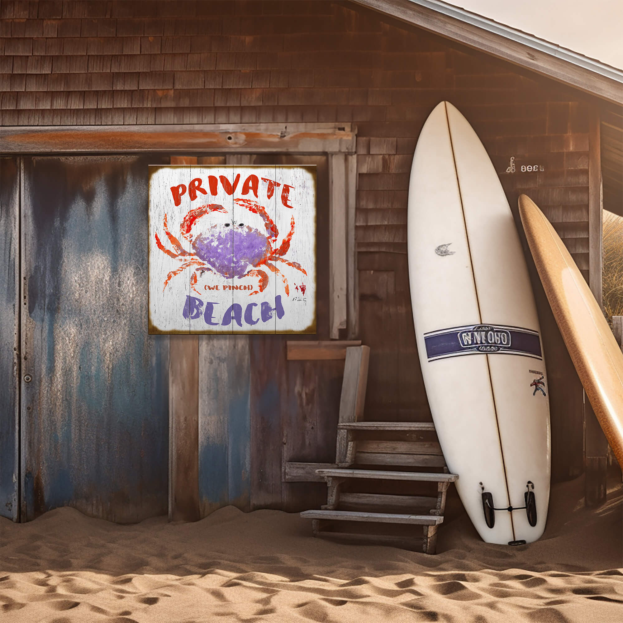 Add a playful touch to your seaside sanctuary with this "Private Beach" sign – a whimsical artwork warning that combines the Gyotaku technique with a cheeky message. The spirited purple and orange crab, seemingly ready to defend its territory, pops against the distressed white backdrop. This sign is perfect for beach homes or businesses looking to display a unique blend of humor and coastal charm.