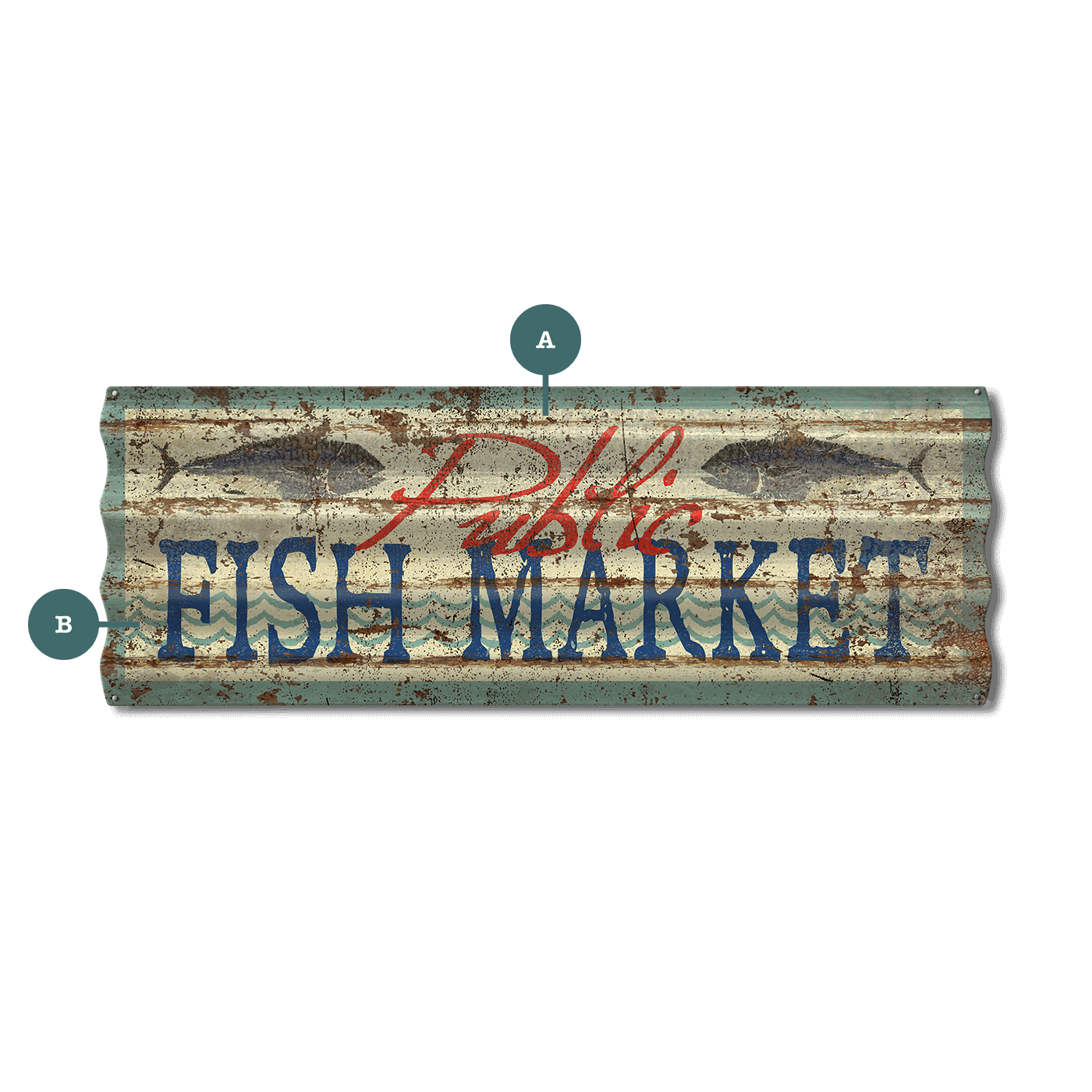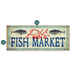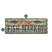Cast a net of coastal flair over your space with this vintage-inspired sign, "Public Fish Market." Bearing the classic charm of a seaside vendor's welcome, this artwork carries the essence of a bustling fish market. Two silhouetted fish, akin to the traditional Gyotaku prints, are suspended against a sea-washed wooden plank backdrop, as if swimming through the ocean currents. The bold, cursive script intertwines with the waves below, inviting a sense of community and daily catch freshness. Ideal for those who appreciate the maritime heritage and seek to bring a splash of the fisherman's wharf into their decor.