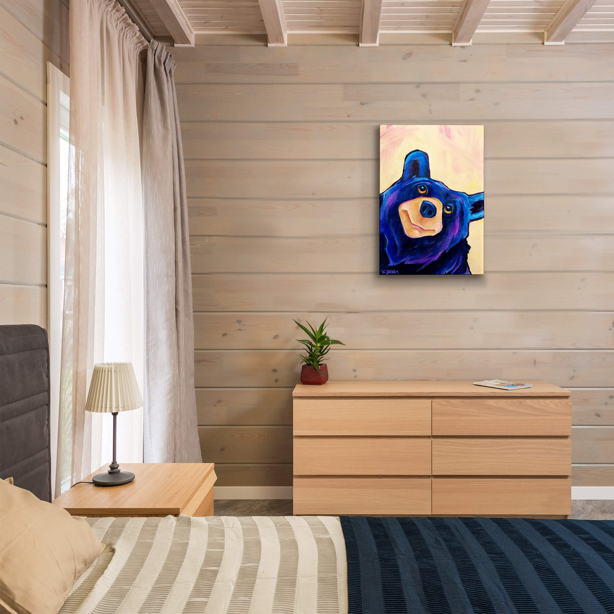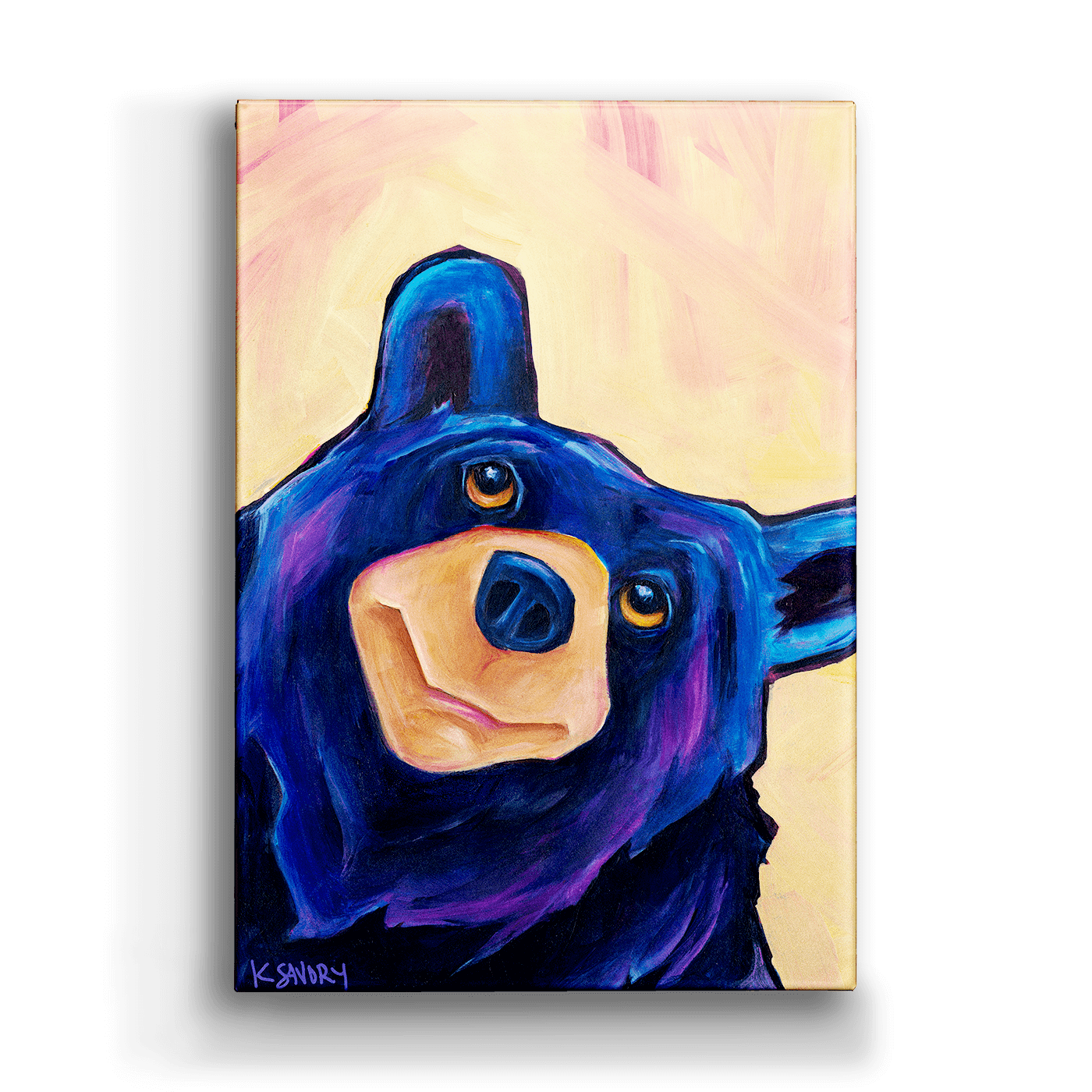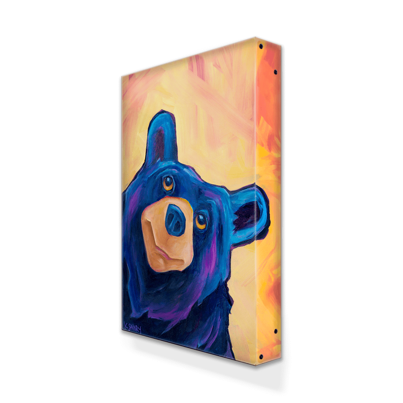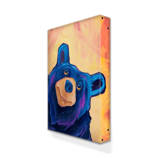 Spark conversation with this bold artwork featuring a curious black bear gazing with a warm and inquisitive expression, set against a soft, glowing yellow background. The dramatic mix of deep purples, blues, and golden tones brings depth and character, making this piece a standout addition to any room. Perfect for nature-inspired, modern, or eclectic decor, this spirited bear radiates charisma and charm.