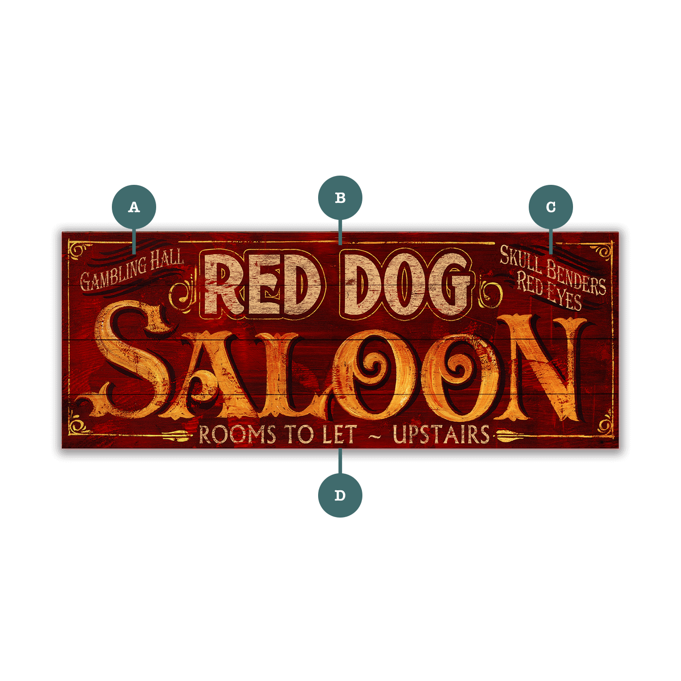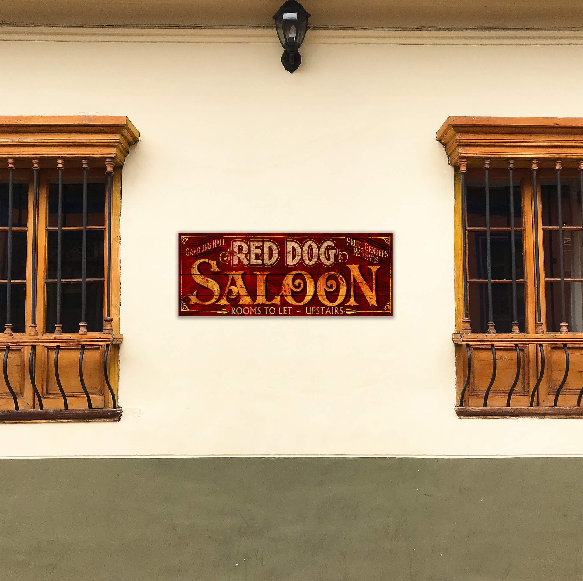 With a deep red hue reminiscent of aged whiskey and frontier dust, this saloon sign exudes the lively spirit of the Old West. Bold, golden lettering declares the name of the establishment, promising a haven for gamblers, risk-takers, and those seeking a night of revelry. The weathered woodgrain backdrop, adorned with ornate scrollwork, hints at an era when whiskey flowed freely, poker tables stayed occupied, and fortunes could change with the turn of a card. Whether it’s a place for celebration or just a respite from the trail, this piece captures the rowdy allure of a bygone saloon.