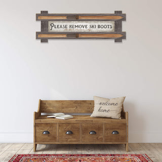 Keep your ski lodge neat and tidy with this elegantly rustic "Please Remove Ski Boots" sign. Perfect for homes, lodges, or businesses in snowy locales, this wall sign serves as a friendly reminder to guests to remove their boots, helping keep your floors clean and dry. This sign not only adds practical function but also enhances any entryway or mudroom with its charming, vintage appeal.