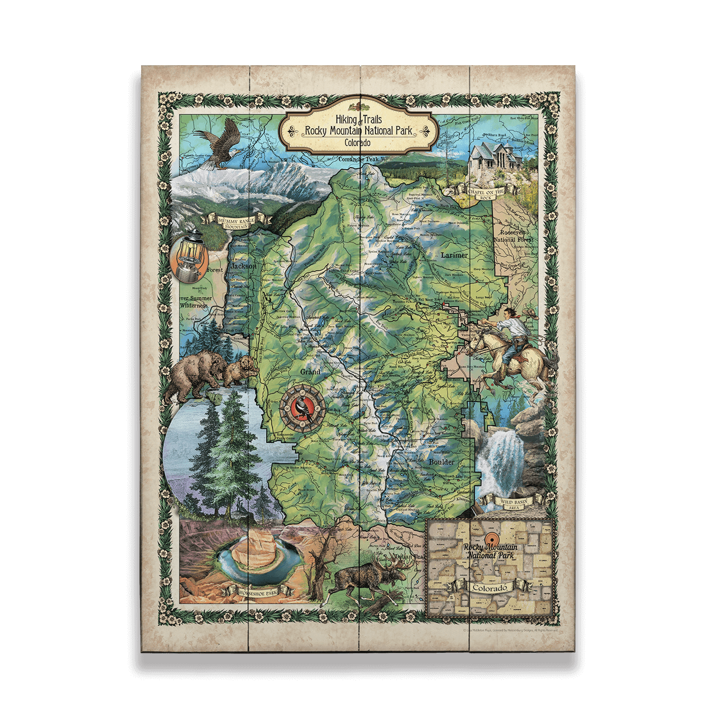 Explore the rugged beauty of Colorado with the "Hiking Trails of Rocky Mountain National Park" map, artistically rendered by Lisa Middleton. This hand-painted masterpiece not only guides you through the park’s varied terrains and famous trails but also enchants with detailed illustrations of local flora and fauna. Ideal for adventurers and nature lovers alike, this map invites you to discover the hidden treasures of one of America's most beloved national parks. Perfect as a gift or a personal keepsake, it brings the great outdoors right into your home.