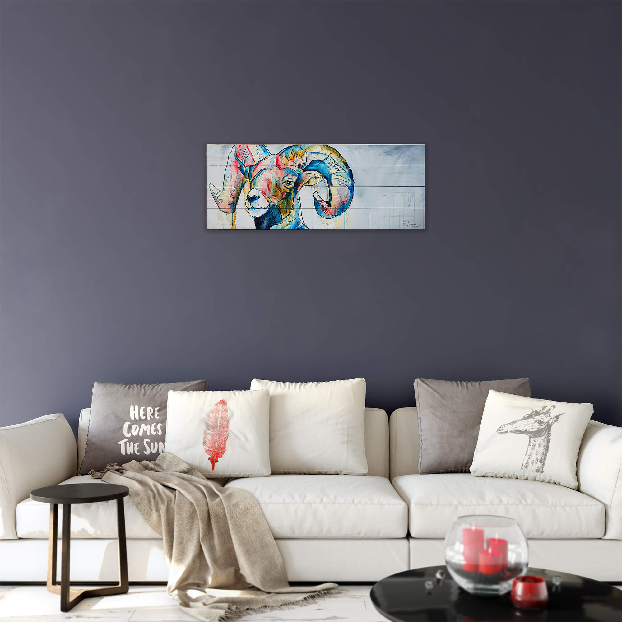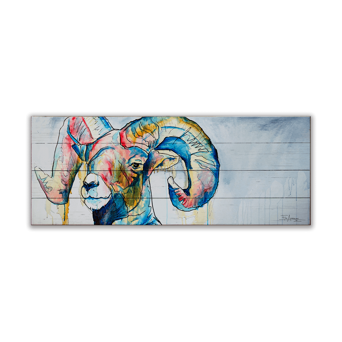 This vibrant artwork captures the majestic essence of a Rocky Mountain ram, also known as a bighorn sheep. The ram's distinctive, curved horns and rugged facial features are brought to life with a colorful palette that highlights its powerful presence. Set against a minimalistic background, this painting emphasizes the ram's natural beauty, showcasing its status as an iconic symbol of the mountainous wilderness. Ideal for wildlife enthusiasts and nature lovers, this piece adds a touch of the wild to any collection.