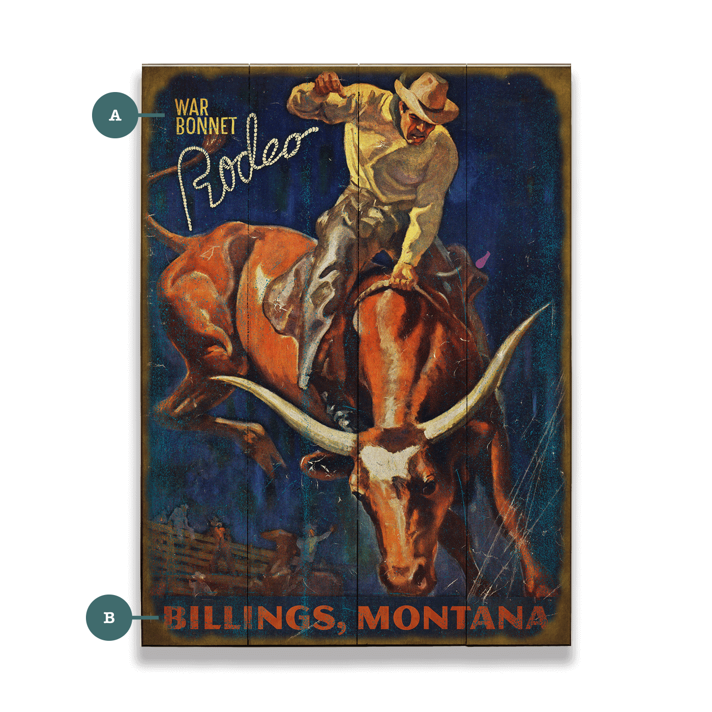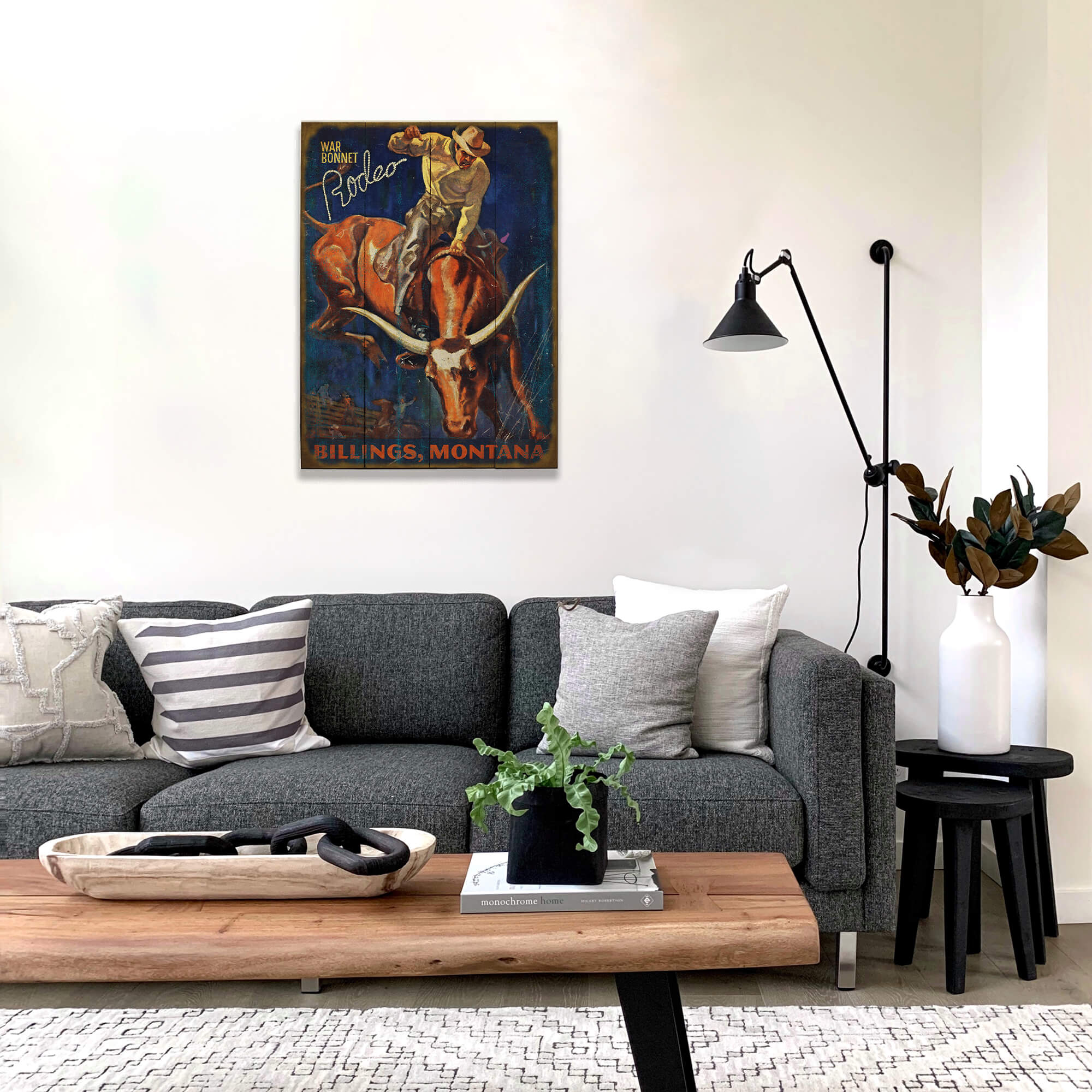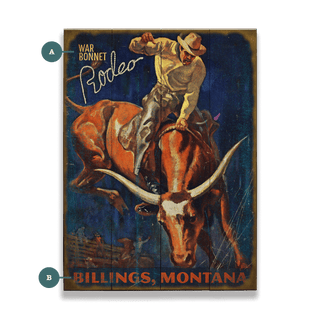This striking vintage-style rodeo artwork captures the raw intensity of bull riding, featuring a determined cowboy gripping tightly as he battles to stay atop a powerful longhorn. The deep, dramatic colors and distressed textures enhance the energy of the moment, evoking the grit and adrenaline of the rodeo arena. Bold typography and classic Western aesthetics give it an authentic, timeworn charm, making it a standout piece for rodeo fans, collectors, and lovers of cowboy culture. Perfect for adding a touch of frontier excitement to any space, this artwork embodies the fearless spirit of the American West.