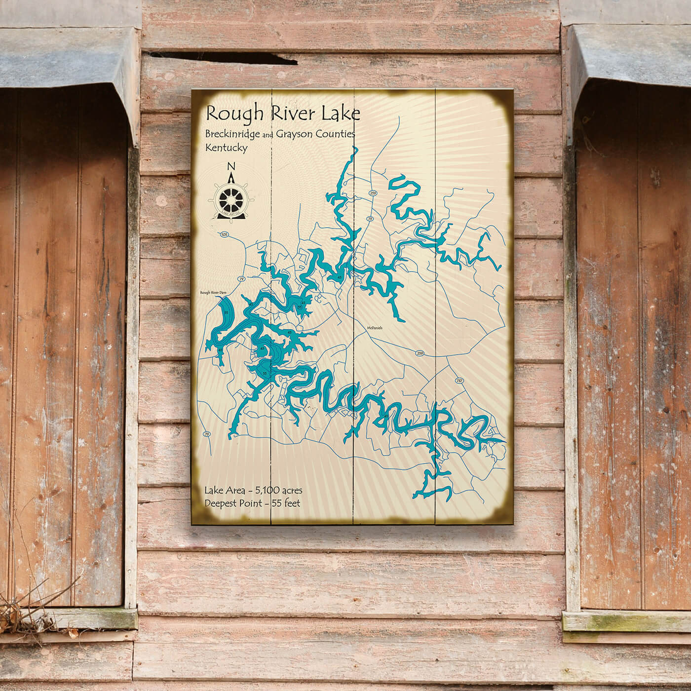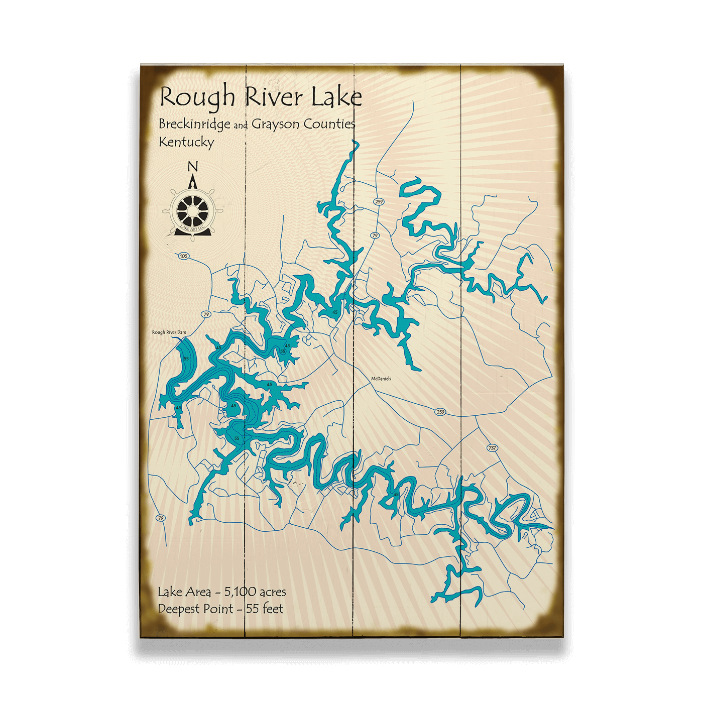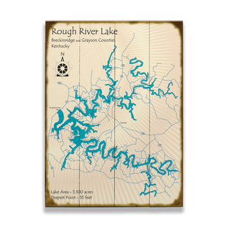Introducing our decorative map featuring Rough River Lake, the 5100-acre meandering lake created by the Rough River Dam in Kentucky. Rough River Lake has a diverse array of aquatic life, including largemouth, white, and Kentucky bass, bluegill, channel catfish, crappie, and rough fish. With a maximum depth of 55 ft, this lake offers ample opportunities for aquatic activities.