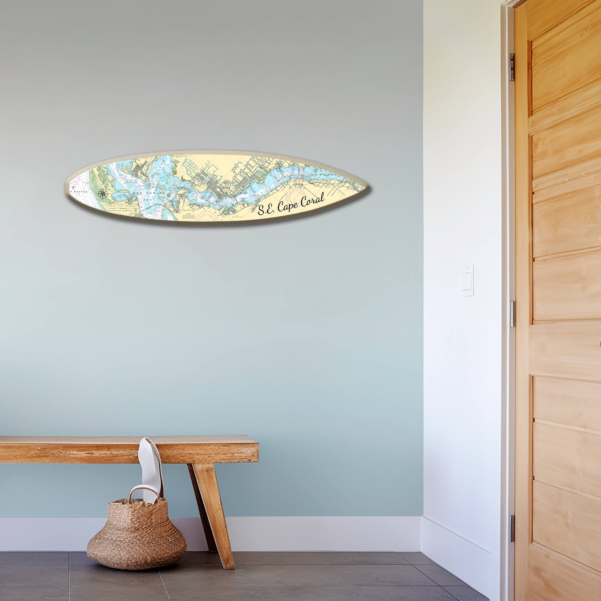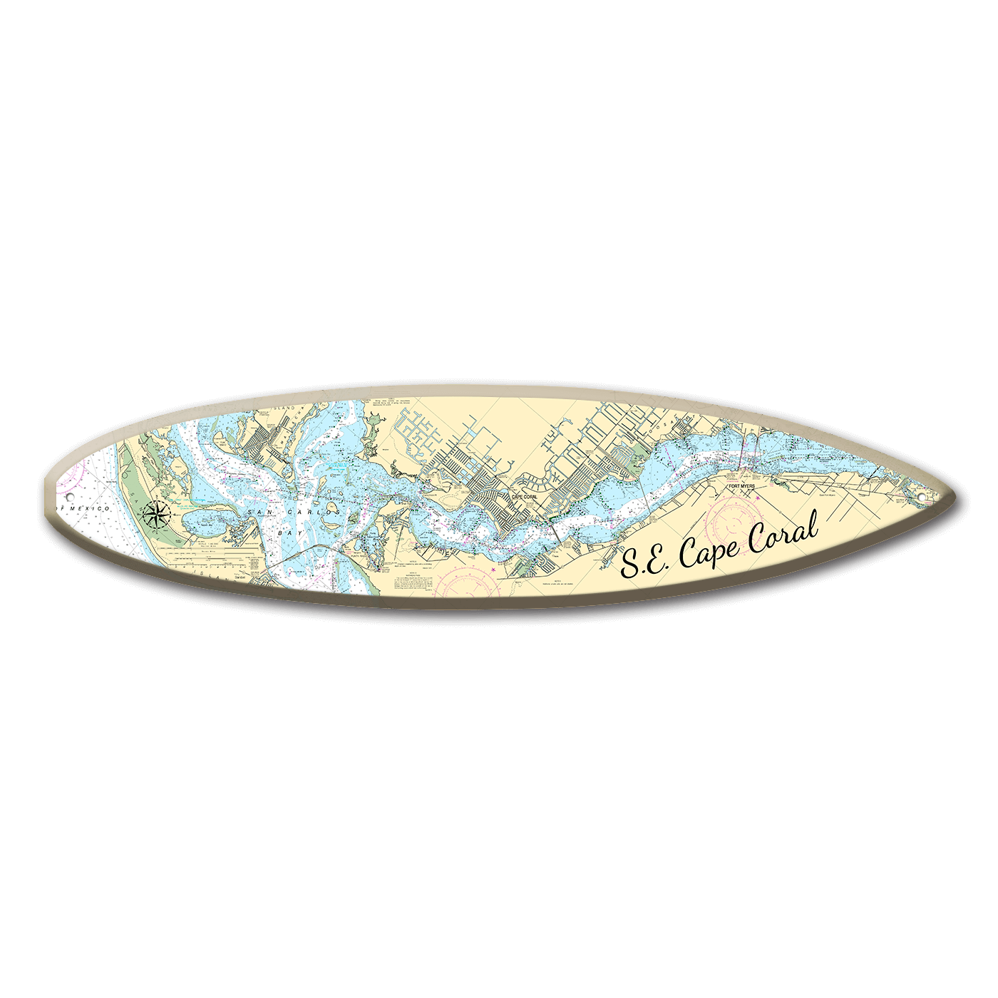 This artwork features a nautical chart of Southeast Cape Coral, Florida, presented in a sleek surfboard-shaped design that highlights the area’s extensive canal system and waterfront access. The chart details the waterways that make Cape Coral famous as a boater’s paradise, offering more miles of navigable canals than any other city in the world. The addition of a decorative compass rose enhances its maritime appeal, while the unique surfboard silhouette gives it a modern coastal flair. Perfect for beach houses, coastal-themed decor, or anyone with a love for life on the water.