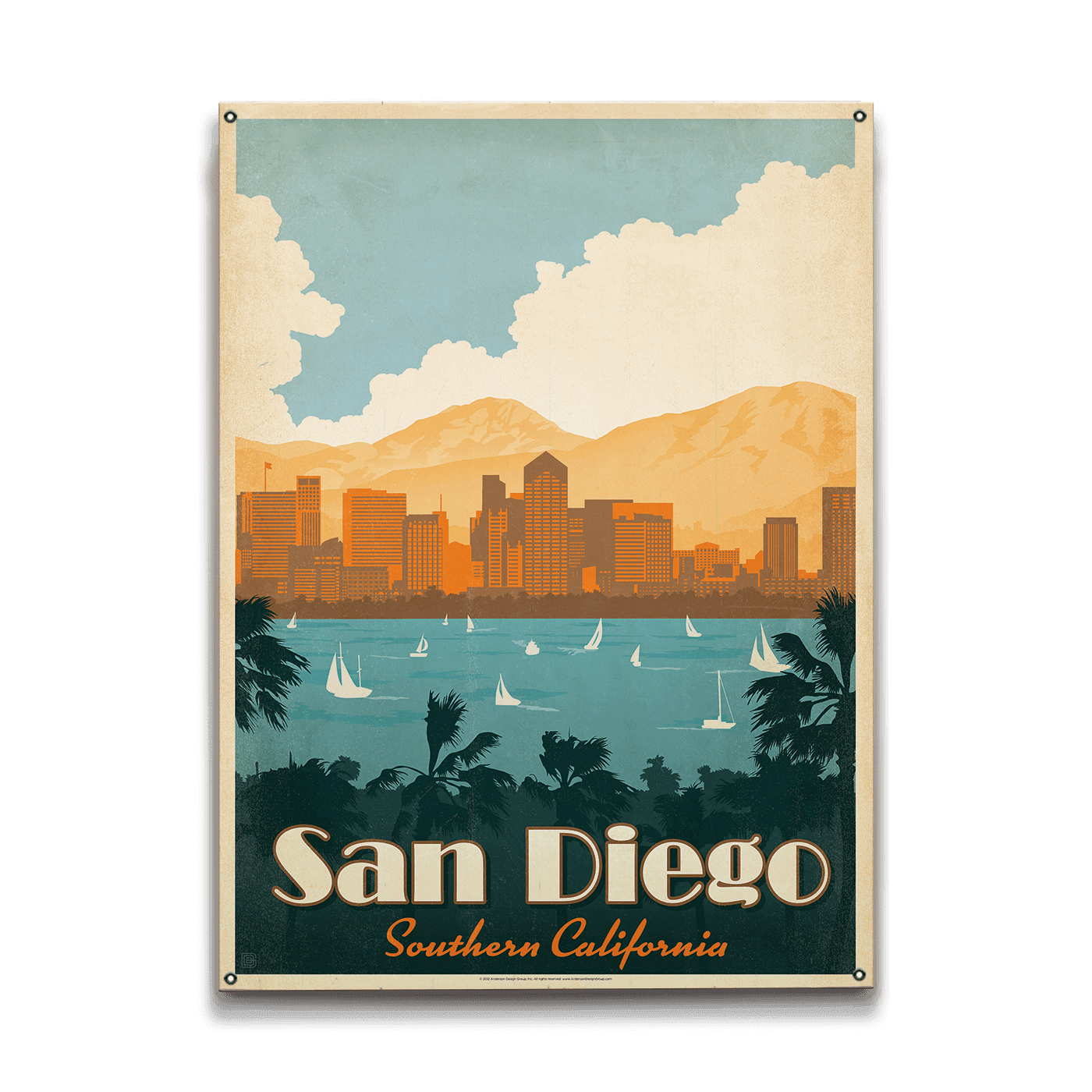 Bask in the coastal allure of San Diego with an artwork that captures the vibrant essence of this sun-soaked city. The poster artfully portrays a bustling San Diego skyline set against the backdrop of rolling hills, with sailboats dotting the shimmering Pacific Ocean. This retro-style image is an invitation to the laid-back lifestyle and scenic beauty of San Diego, making it a perfect piece for admirers of Californian cities and nautical charm.