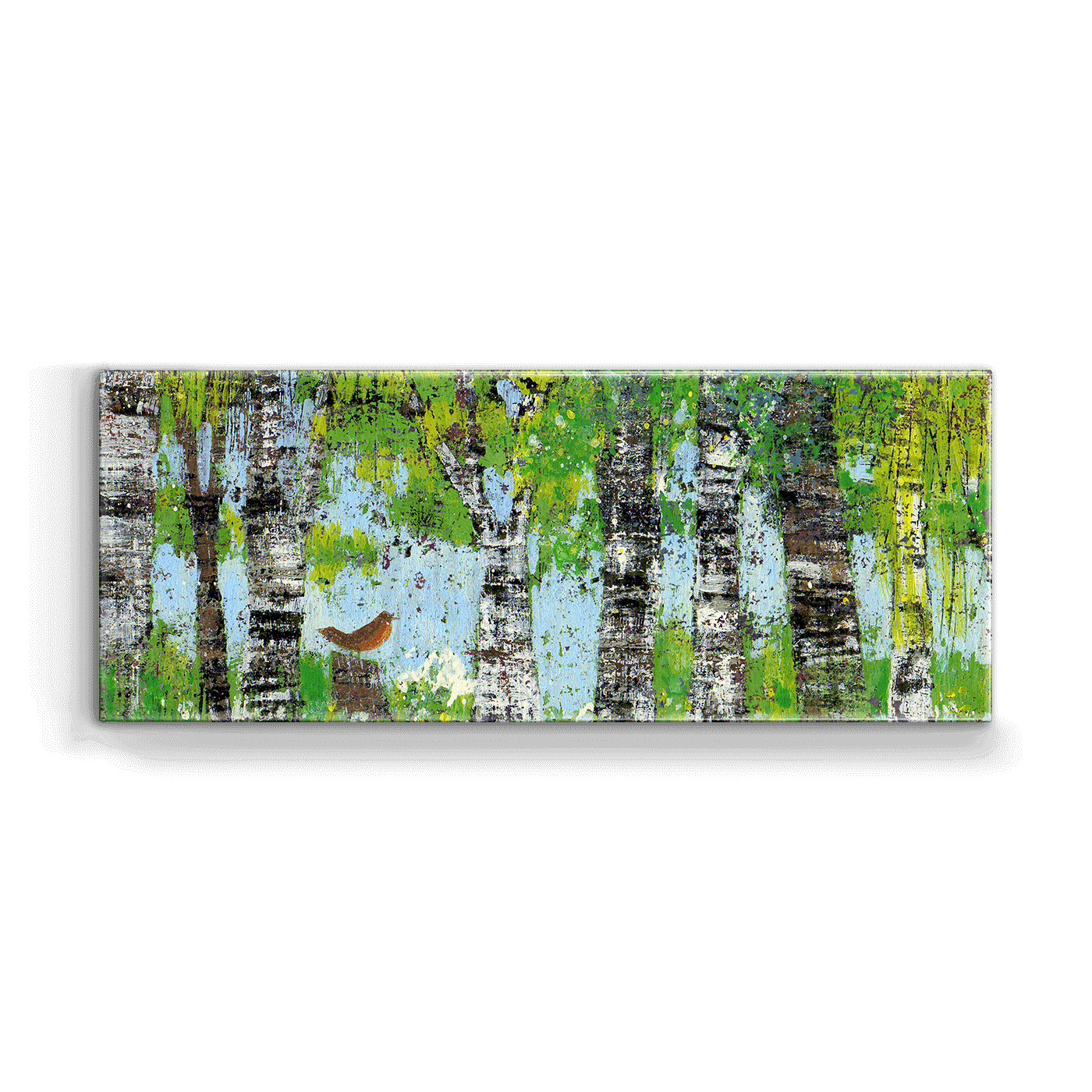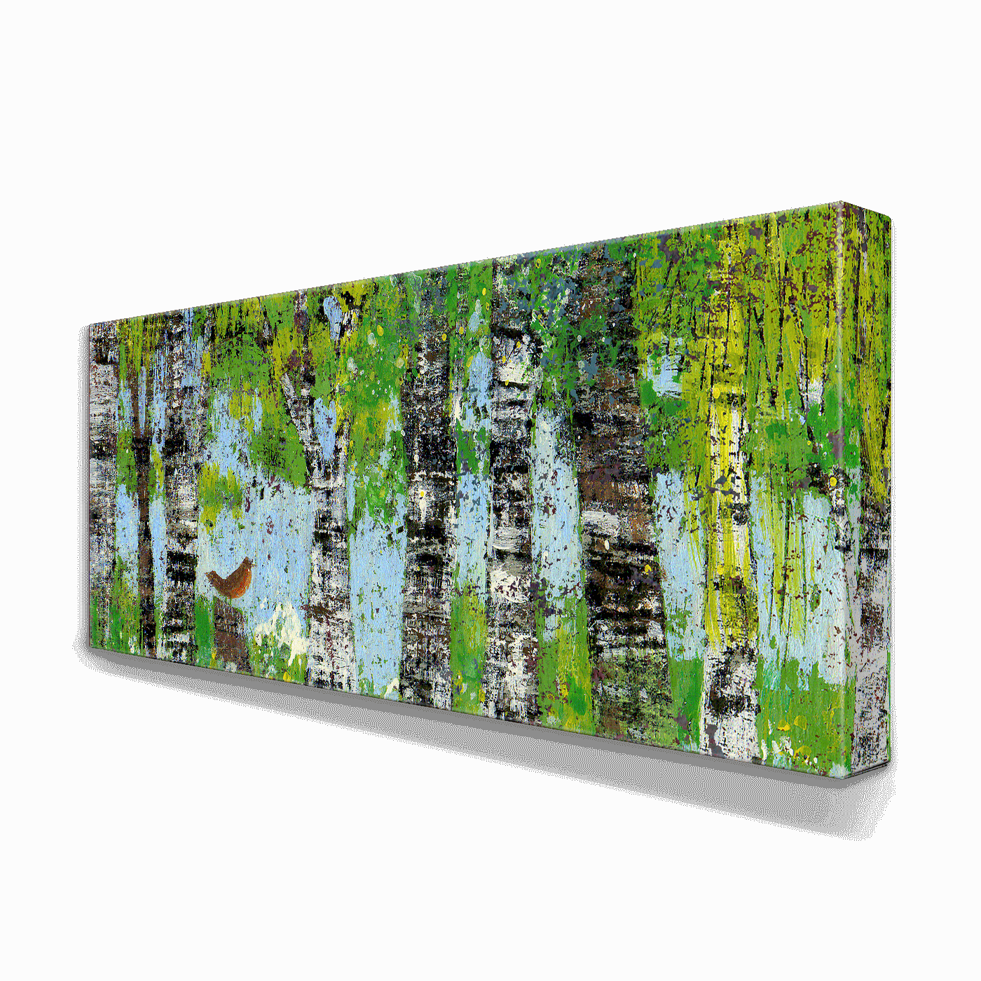 This vibrant artwork captures the essence of spring with a fresh and lively depiction of budding trees against a bright backdrop. The serene blues and vivid greens create an atmosphere of rebirth and renewal, perfect for invoking the spirit of the season.
