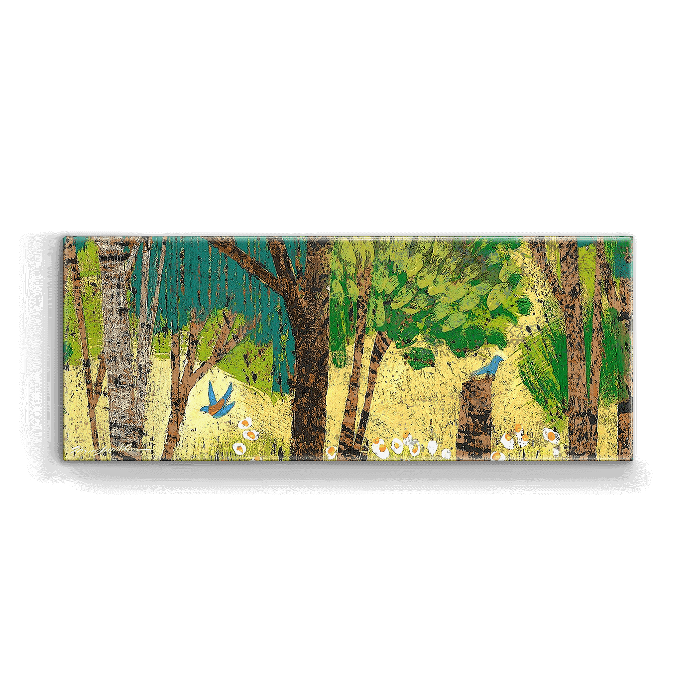 "Summer Flourish" radiates the warmth and vibrancy of summer through its depiction of sun-drenched trees and playful birds. The rich yellows and lush greens against a background of golden light capture the full bloom and dynamic energy of the season. This piece is ideal for those looking to bring the joy and brightness of summer indoors.