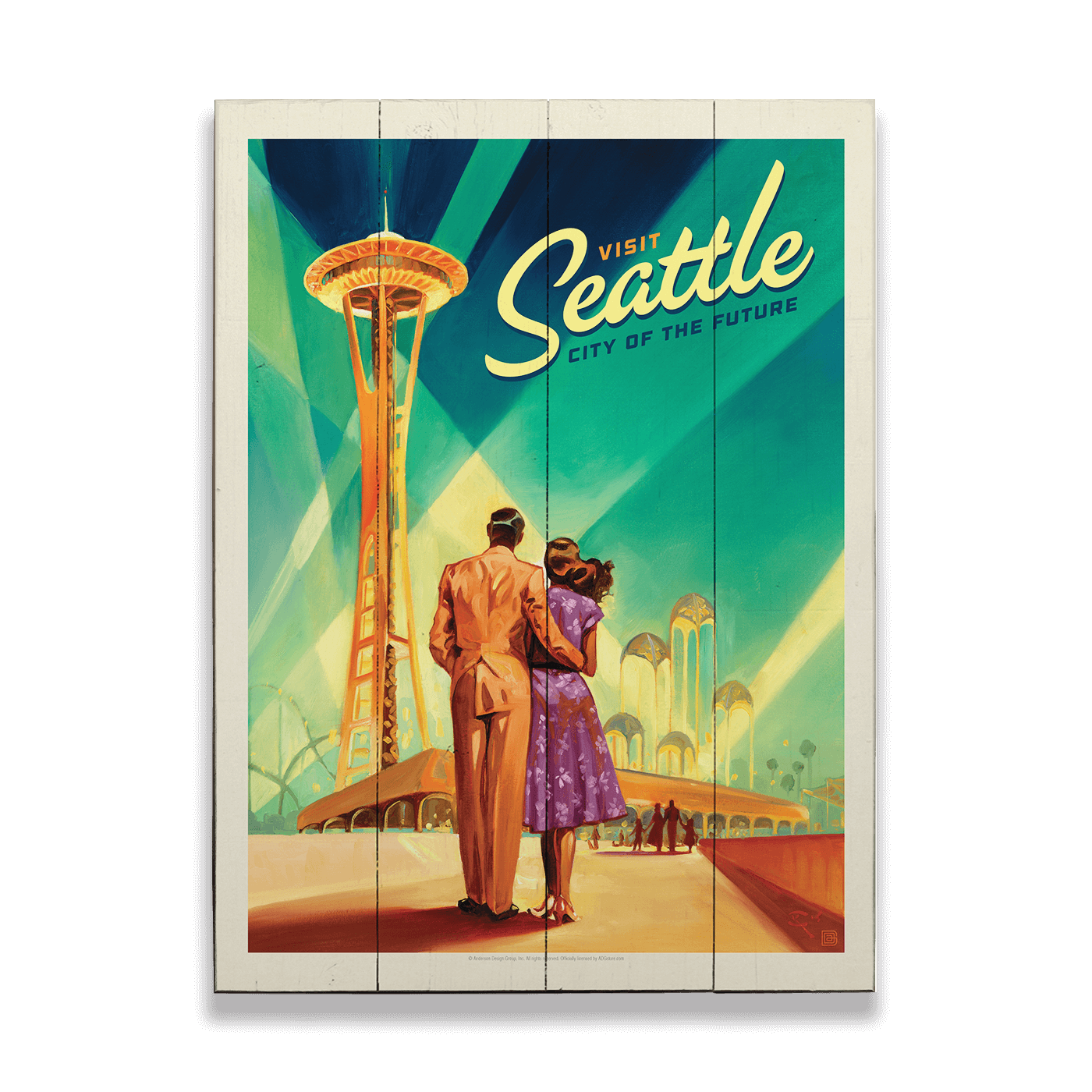 A sweeping retro-futuristic vision of Seattle, this artwork captures a stylish couple gazing toward the iconic Space Needle beneath dramatic, light-filled skies. Clean architectural lines, warm mid-century tones, and bold perspective evoke the optimism and design-forward spirit of the city’s World’s Fair era. Both nostalgic and strikingly modern, the composition celebrates Seattle’s legacy of innovation, making it a standout piece for contemporary interiors, travel-inspired spaces, and lovers of classic American cityscapes.