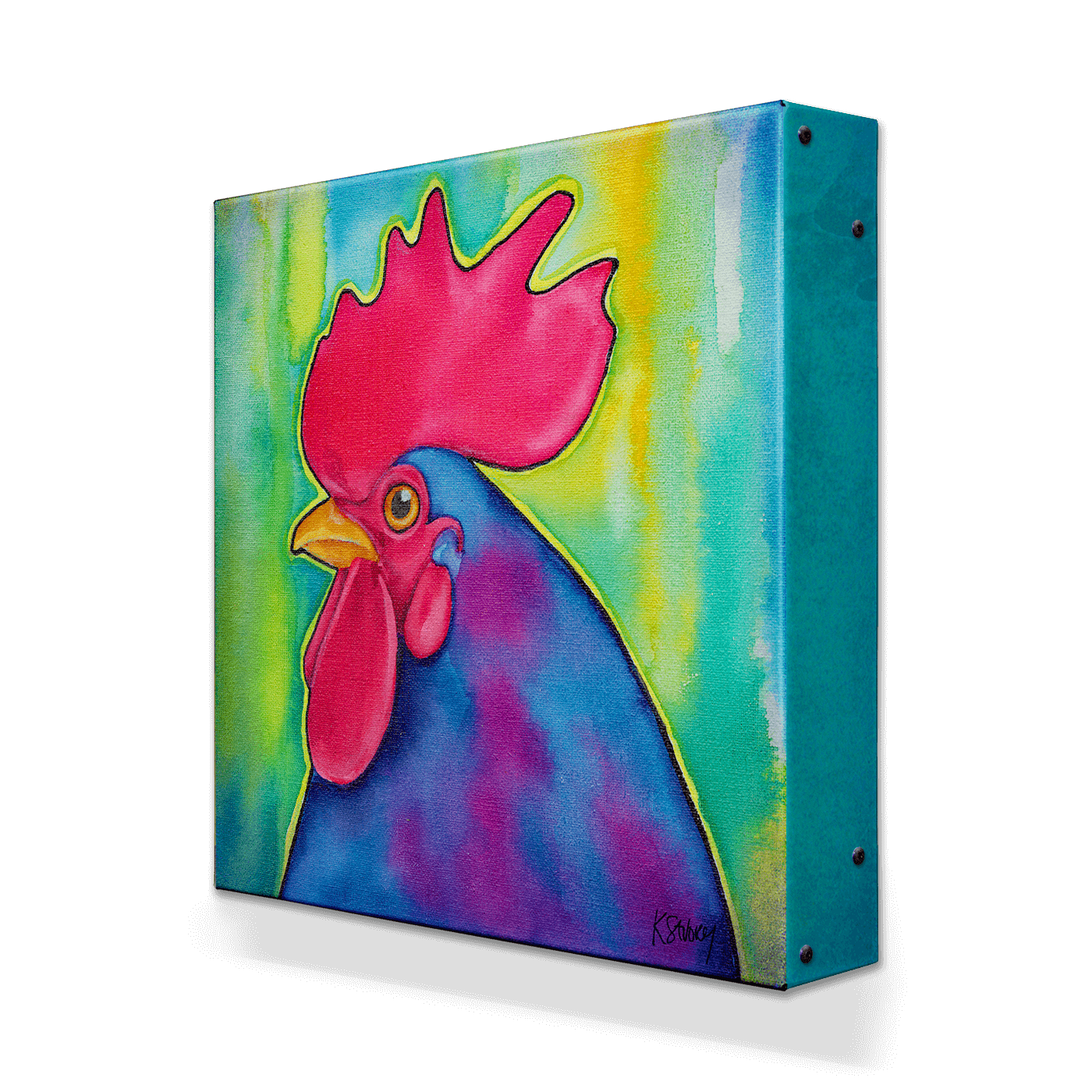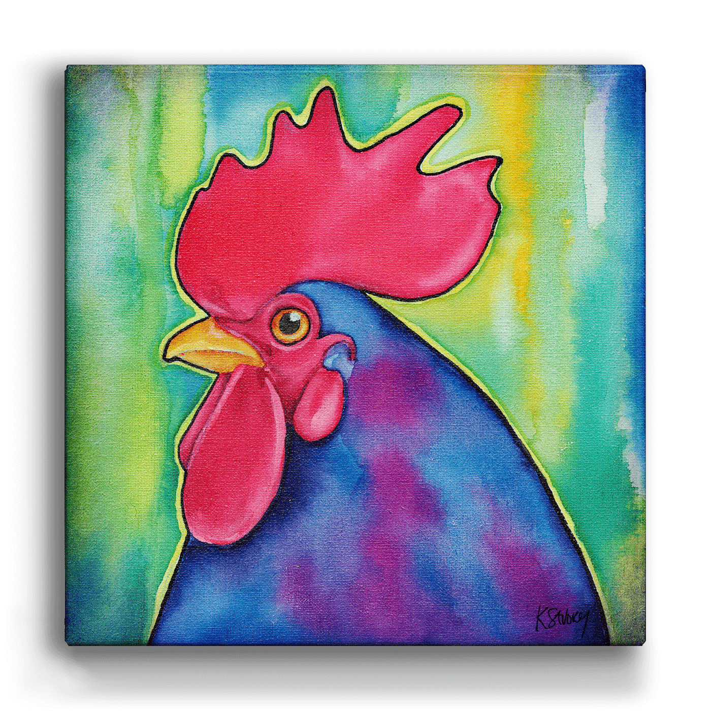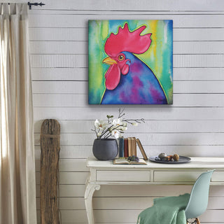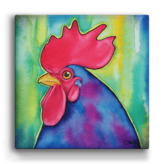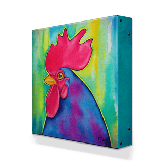 Make a bold statement with this vibrant rooster artwork. Bursting with rich colors, from the striking red comb to the deep blue and purple feathers, this piece brings bright energy and personality to any space. Perfect for adding a touch of farmhouse charm with a modern twist, it’s an eye-catching addition for animal lovers and art enthusiasts alike.