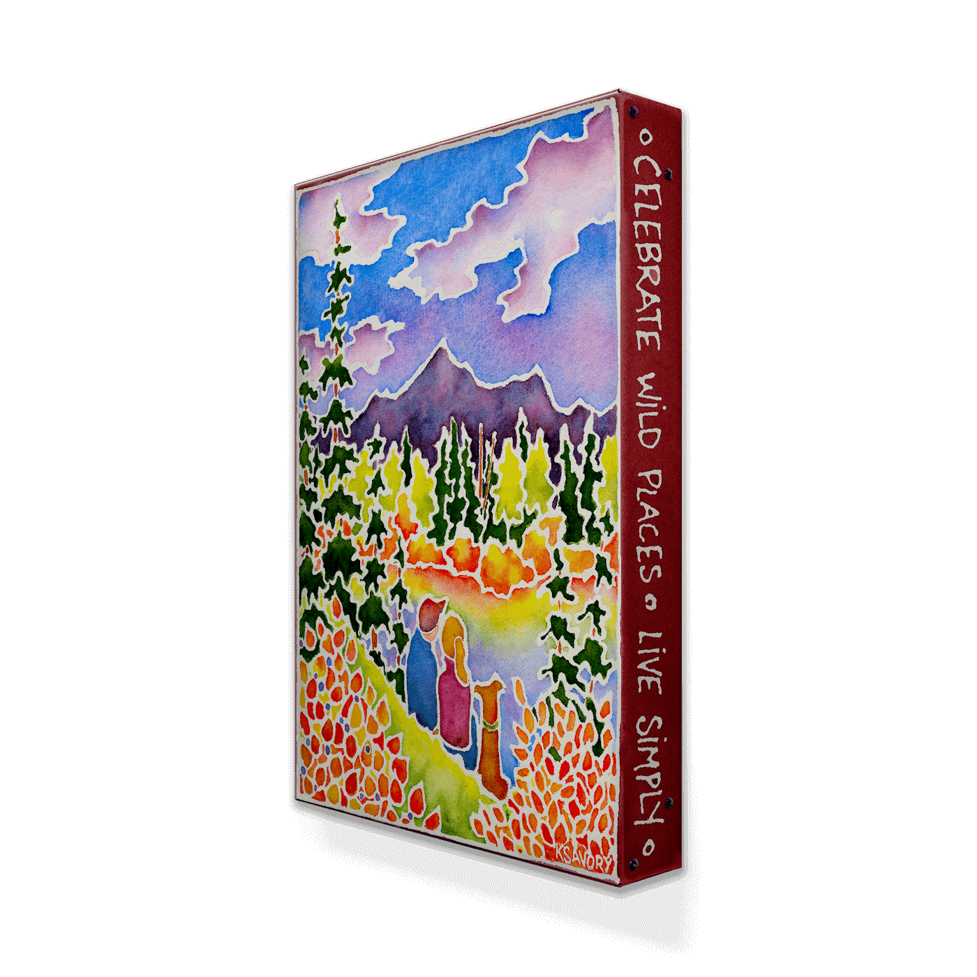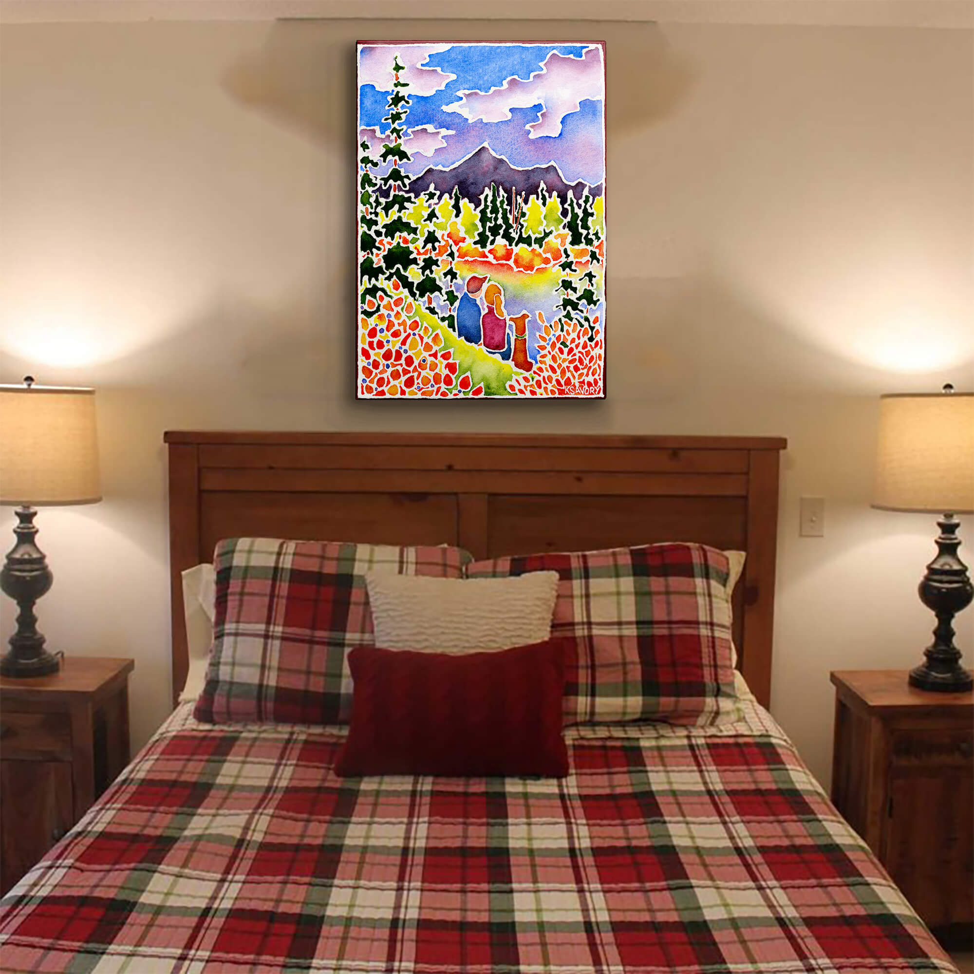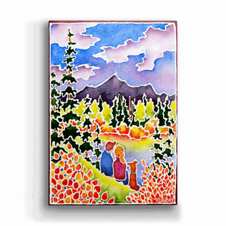 This painting offers a heartwarming glimpse of a couple and their dog enjoying a vibrant autumn landscape. Set against a backdrop of majestic mountains and a colorful forest, the artwork uses a rich palette of reds, oranges, and greens to depict the changing leaves, providing a vivid contrast to the cool blues of the sky. The scene captures a perfect moment of tranquility and companionship in nature, making it an ideal piece for those who cherish outdoor adventures and the beauty of fall.