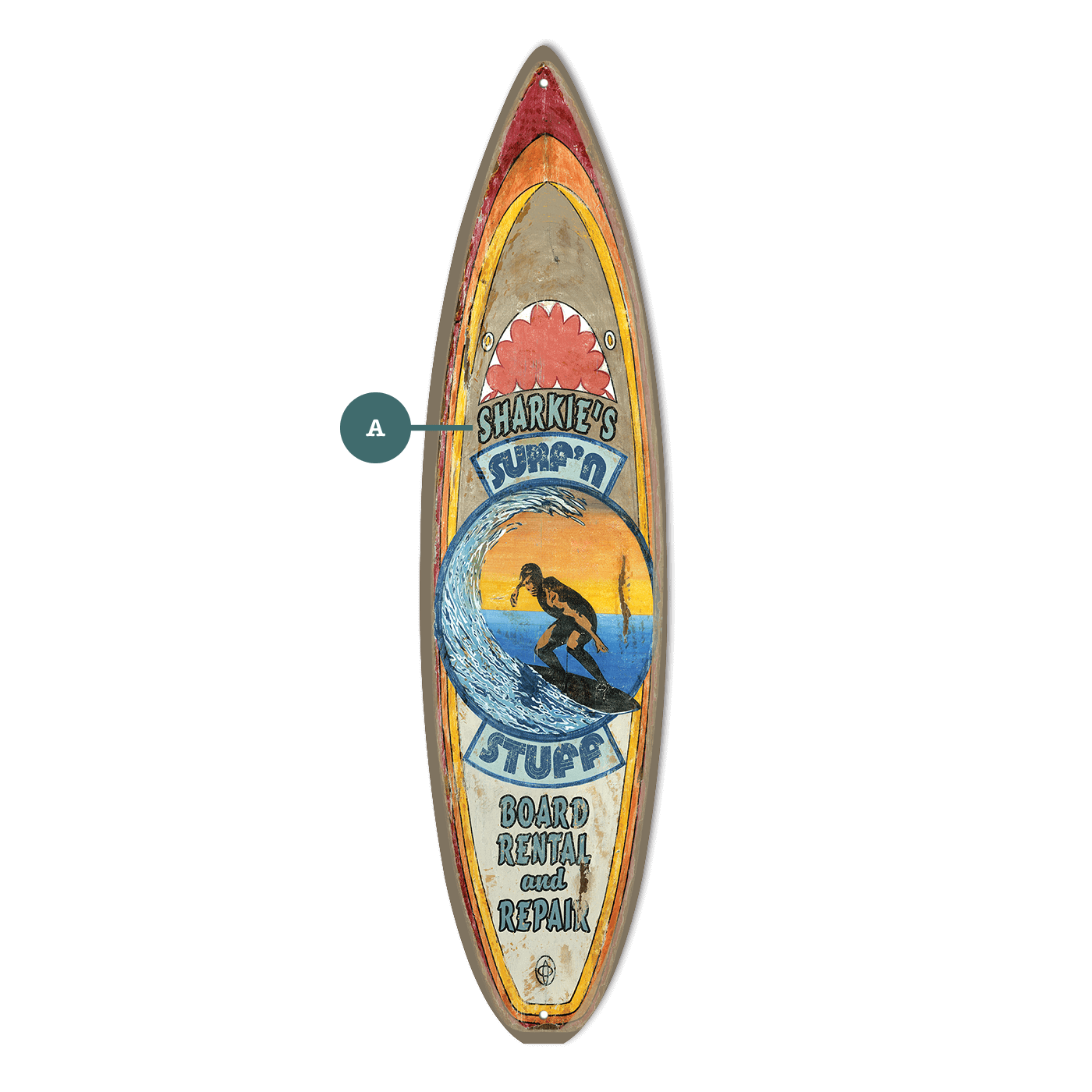 This surfboard-shaped artwork features a bold, vintage-inspired design with a surfer riding a wave at sunset. Complete with retro colors and fun surf shop graphics, it adds an adventurous coastal vibe to any space. Perfect for surf shops, beach cottages, or nautical-themed rooms, this piece brings the thrill of the waves indoors. Personalization options are available to create a unique, custom touch for your décor.