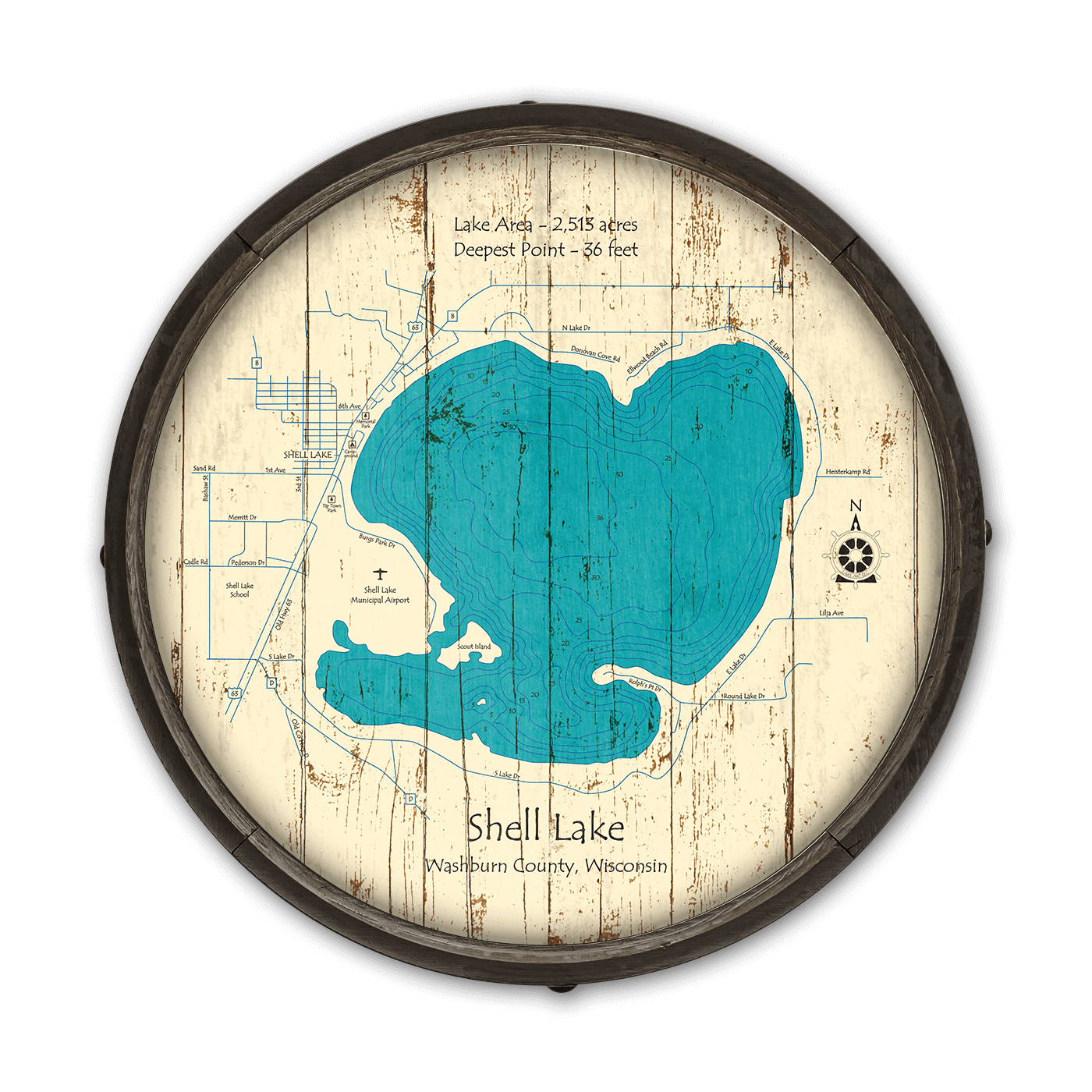 Introducing our Shell Lake map, a captivating piece that celebrates the expansive beauty of one of Wisconsin's largest and most pristine lakes. Spanning over 2,513 acres with depths reaching 36 feet, Shell Lake in Washburn County, Wisconsin, is depicted with artistic elegance and geographical accuracy.