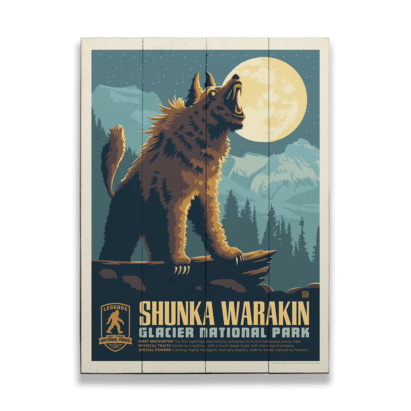 Evoke the spirit of Glacier National Parks untamed wilderness with Shunka Warakin, a captivating art piece by Anderson Design Group. This eerie depiction brings the Shunka Warakin — a creature steeped in the indigenous Loway lore — to life with piercing wild eyes and a formidable presence that commands the landscape. Against a backdrop of serene forests and rugged peaks beneath a luminous full moon, this mythical being, said to be part wolf and part hyena, stands poised in a howl that resonates with the ancient mysteries of the park. Revered for its cunning intelligence and elusive nature, this legendary predator's image will stir the imagination and bring a touch of the mystical to any space. A piece that both captivates and intrigues, it’s an homage to the folklore that still whispers through the pine-scented air of Glacier's vast expanses.