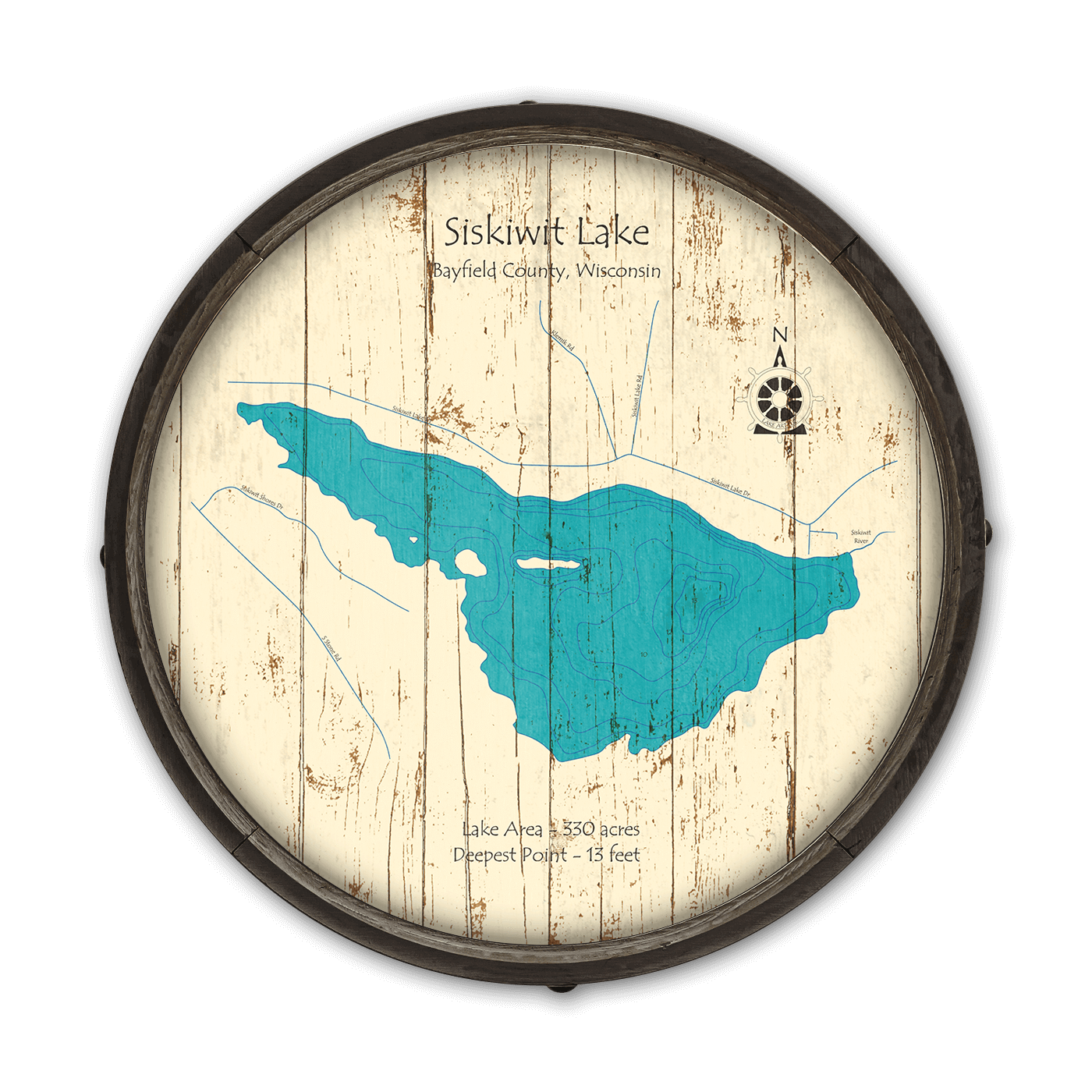 Set your sights on the unique contours and quiet charm of Siskiwit Lake with this elegant map artwork. Located in the serene Bayfield County, Wisconsin, Siskiwit Lake is beautifully rendered here, displaying its 330-acre expanse and a maximum depth of 13 feet.