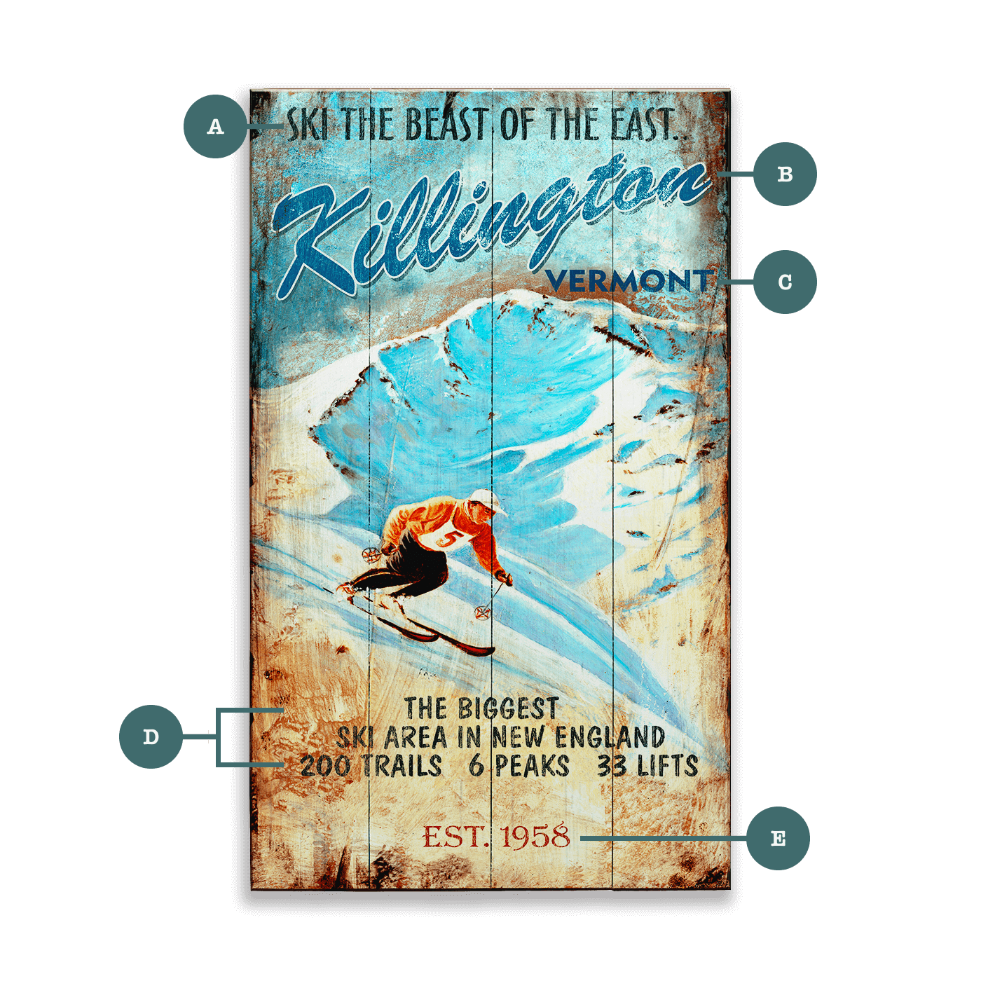 Enjoy complimentary personalization for this piece, meticulously handcrafted by our graphic design team. Specify your desired text for points A, B, C, D, and E. To ensure perfection in your custom piece, please verify your text carefully. Missing personalization information will revert to our default design as shown. To remove all text from a field, type "Remove" in that field.