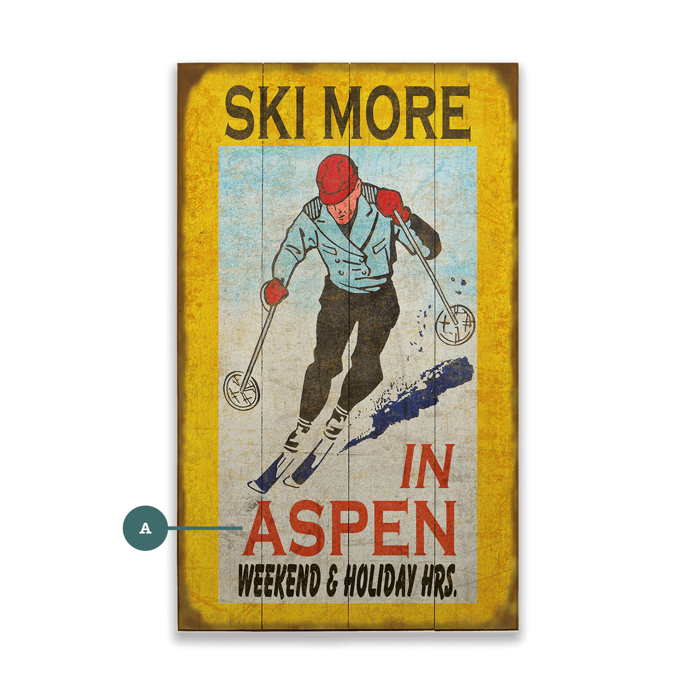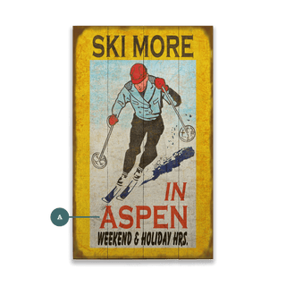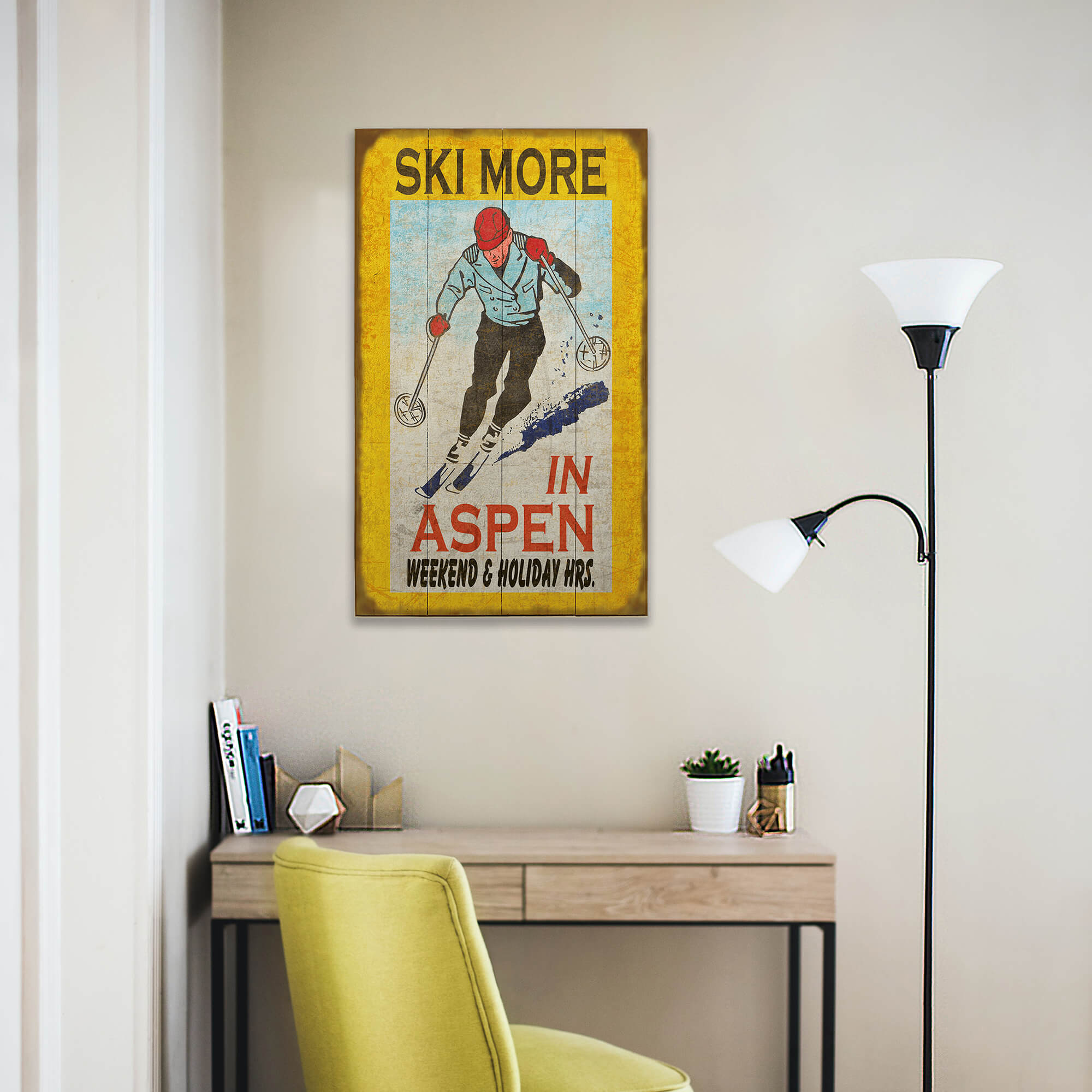 This vibrant artwork captures the spirit of skiing with a classic and energetic depiction of a skier in motion. This piece is styled with a rustic, vintage flair, incorporating a textured background and bold typography that encourages viewers to "ski more." Ideal for enthusiasts of winter sports, this artwork adds a dynamic touch to any space, from ski lodges to personal homes. It serves as an inspiring reminder to make the most of the winter season.