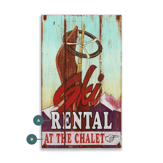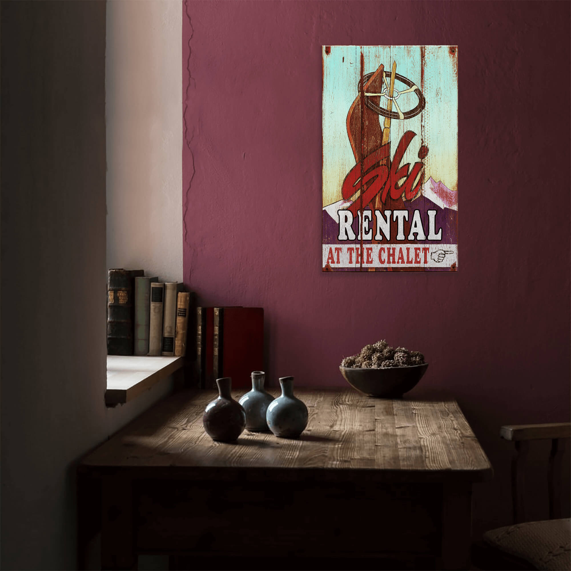 This retro-inspired ski rental artwork captures the fun and adventure of a classic mountain getaway. Featuring vibrant colors and a weathered, rustic look, this piece evokes a sense of nostalgia and outdoor excitement. Perfect for ski lodge décor, cabins, or those who love vintage winter sports aesthetics, this artwork adds a charming, old-school vibe to any space. Its bold lettering and playful design make it an eye-catching addition for anyone looking to bring a touch of the slopes into their home or business.