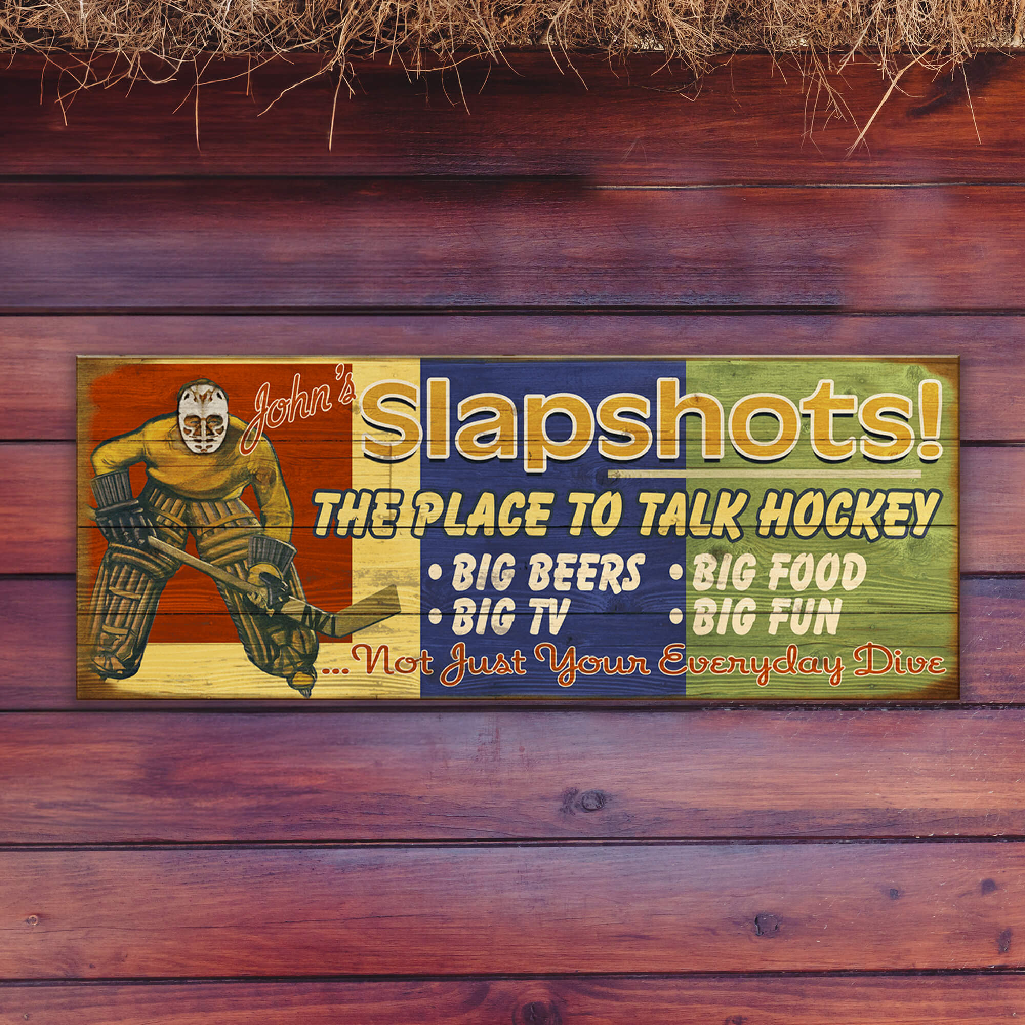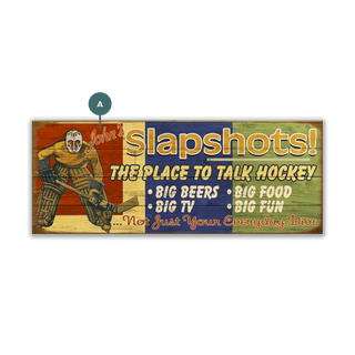 This vibrant artwork captures the energy and camaraderie of hockey culture, showcasing a bold design with a retro goalie and lively typography. Celebrating the ultimate spot to connect over the sport, it highlights the essentials: beer, food, TVs, and fun. Perfect for hockey enthusiasts, this piece pays tribute to the passion and excitement of the game, making it a great addition to any space dedicated to sports or lively gatherings. A nod to both nostalgia and community, it embodies the spirit of a true hockey haven.