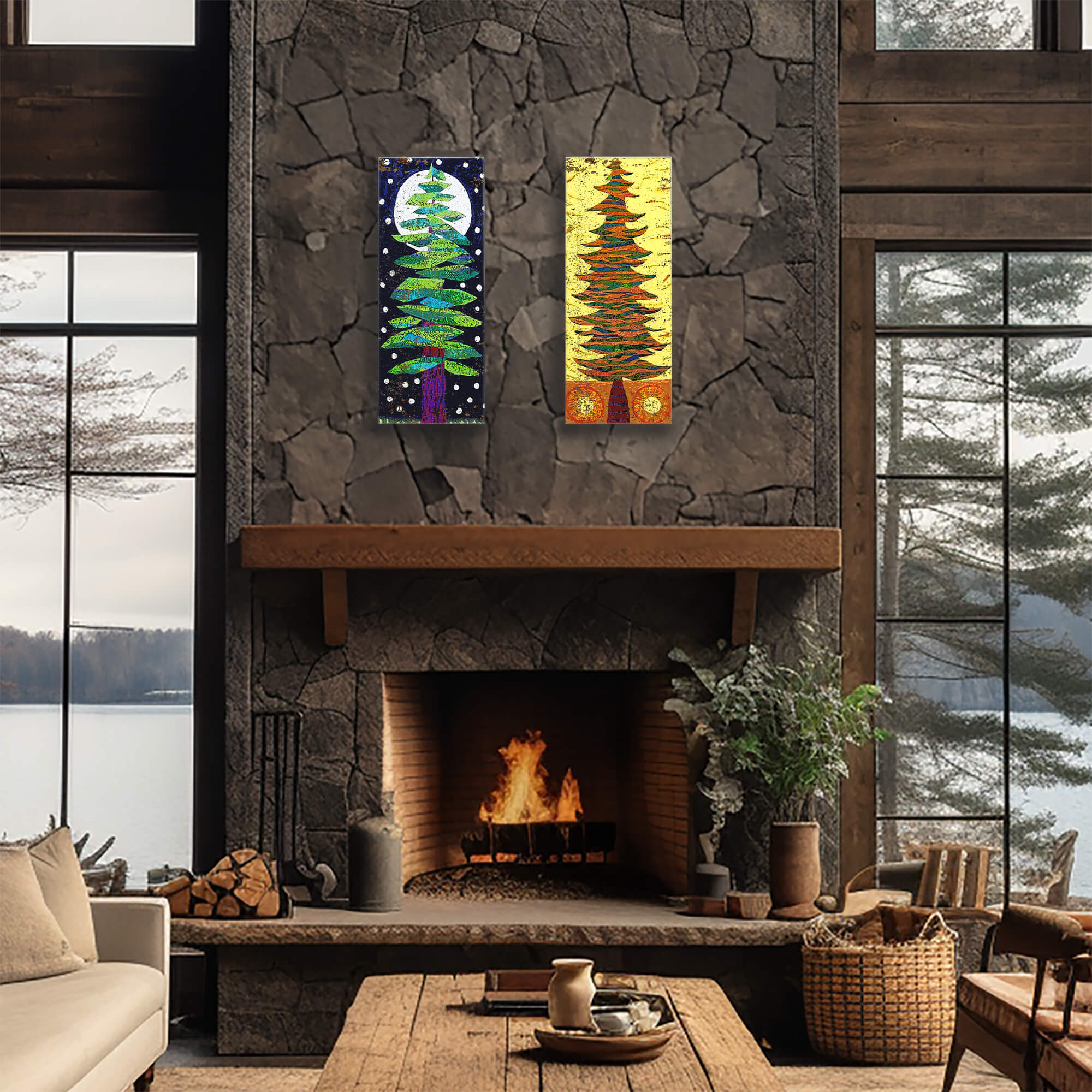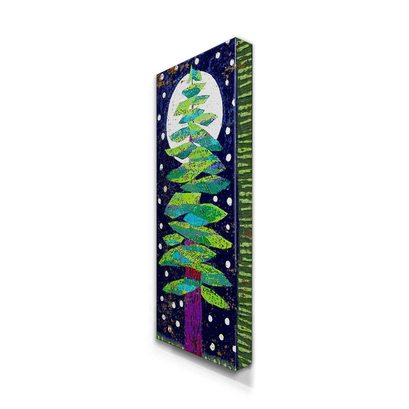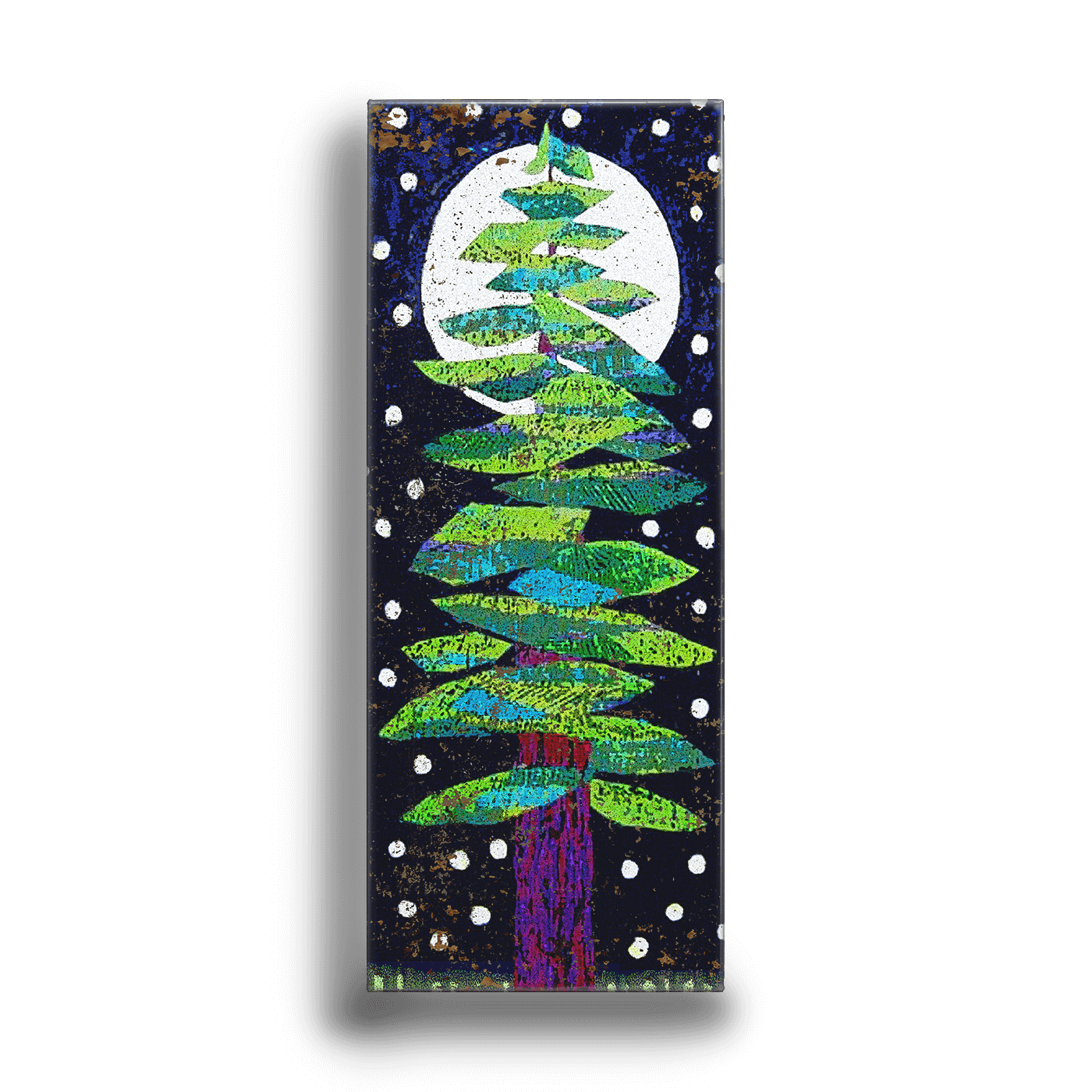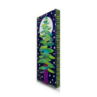 Bring a touch of whimsy and nature to your space with this vibrant artwork of a stylized evergreen tree. The layered green branches pop against a deep blue background, with a glowing full moon and bright white accents evoking falling snow or stars. Ideal for nature lovers and those seeking a connection to the outdoors, this piece is perfect for creating a cozy, yet modern focal point in your decor.