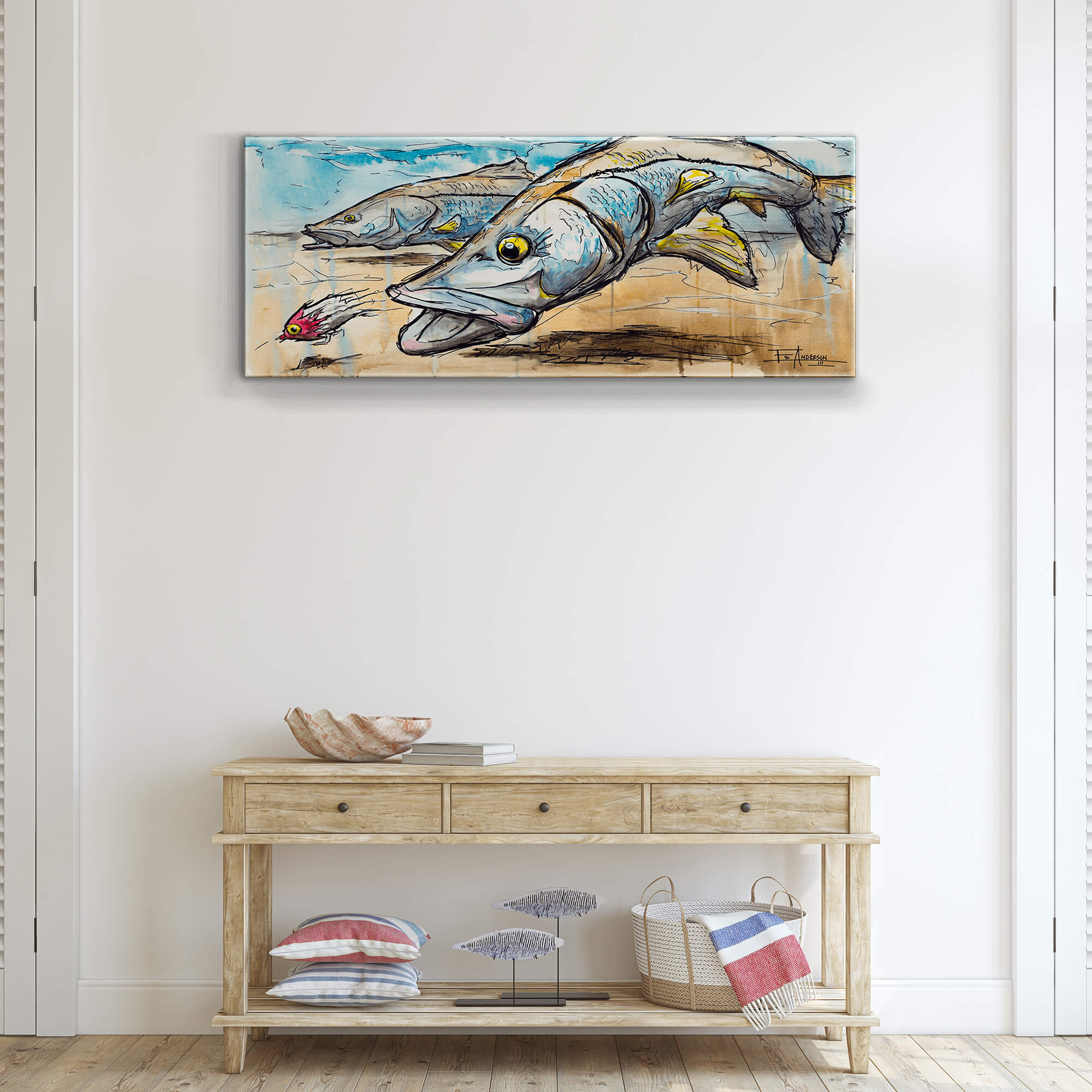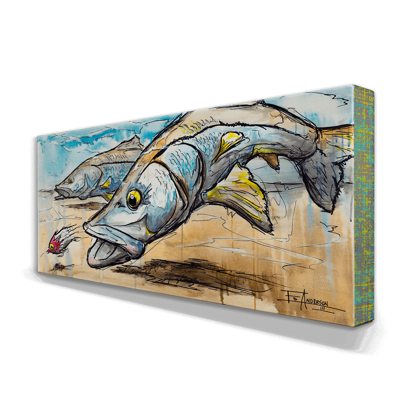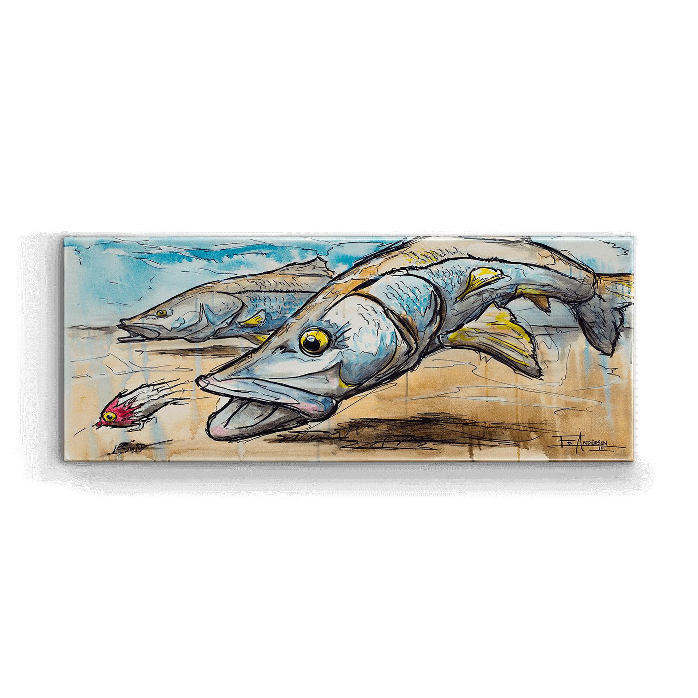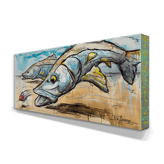 This dynamic artwork showcases two snooks in their natural habitat, with one energetically pursuing a lure. The vivid detail in the fish's scales and the swirling water convey the intense energy of the chase. Above, the serene sky and shoreline add a touch of tranquility, offering a contrast to the underwater action. This striking piece captures the thrill of fishing, making it an ideal addition to any collection that celebrates marine life or angling adventures.