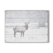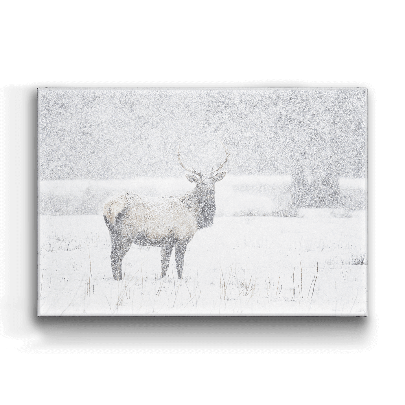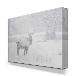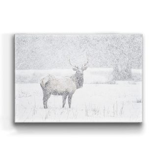 Experience the essence of winter's majesty with this striking image that captures the noble grace of a bull elk amidst a gently falling snowstorm. The stark contrast of the elk's silhouette against the pure white snow evokes a sense of solitude and the quiet strength of nature.