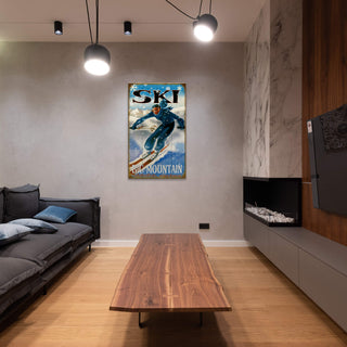 This artwork captures the exhilarating motion of skiing, featuring a skier cutting through a snowy mountain landscape with confidence and passion. The rich blue tones and intricate snowflake details create a vivid winter scene, evoking the crisp air and pristine beauty of the slopes. The skier's dynamic pose conveys speed and skill, while the scenic backdrop adds depth and character. Ideal for those who cherish the spirit of alpine adventures, this piece combines the energy of the sport with the serene charm of the mountains.