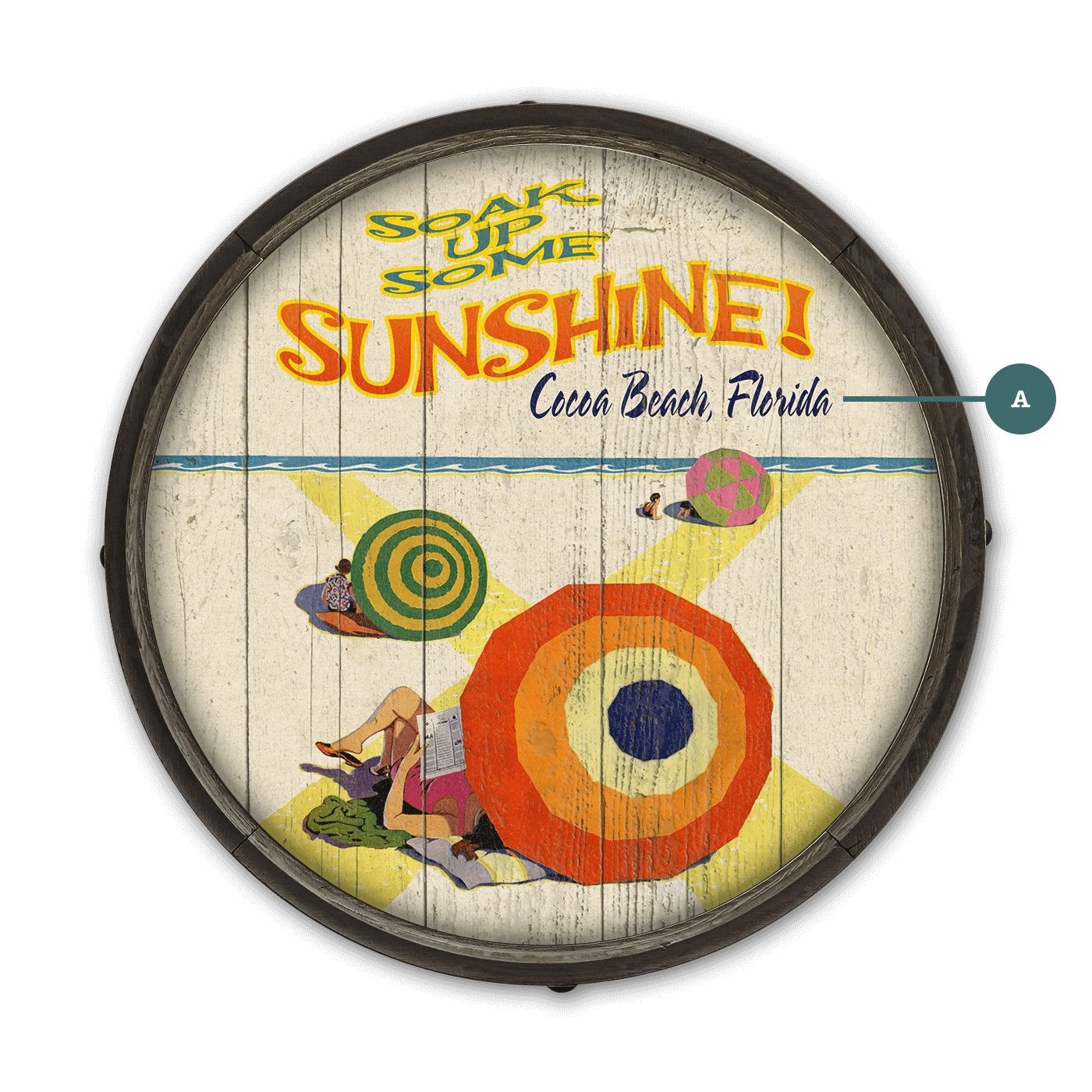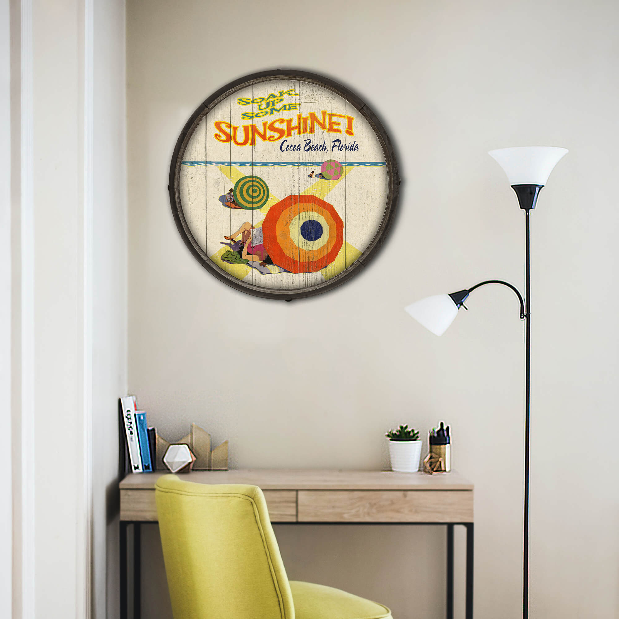 Introducing our vintage-style sign, "Soak Up Some Sunshine" from Cocoa, Florida! This eye-catching artwork captures the vibrant and nostalgic essence of beach days, featuring colorful umbrellas and a relaxing coastal scene. Perfect for adding a touch of retro charm to your home or beach house decor. Embrace the warmth and joy of sunny Florida with this delightful piece, ideal for anyone who loves vintage aesthetics and beach vibes. Add a splash of sunshine to your space today!