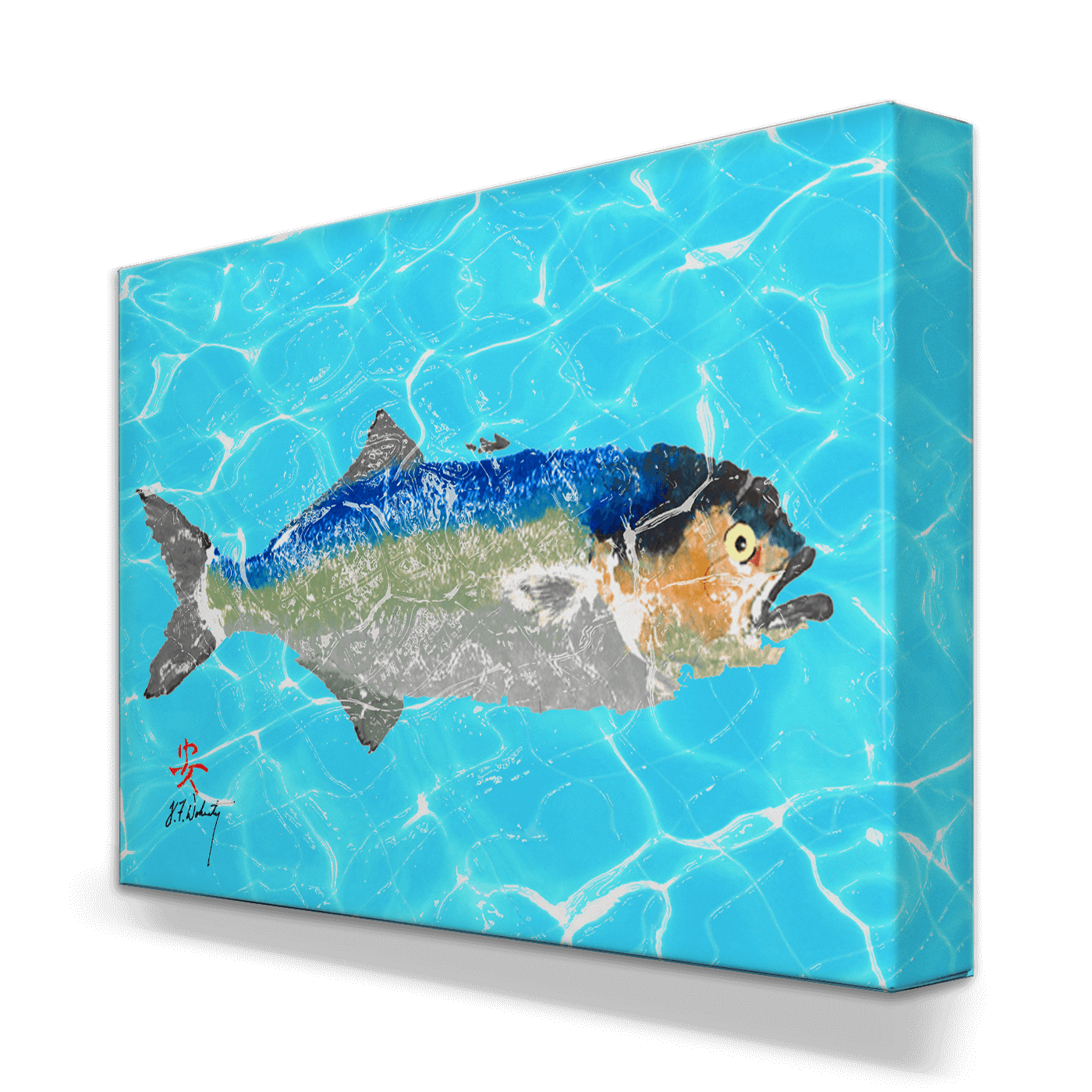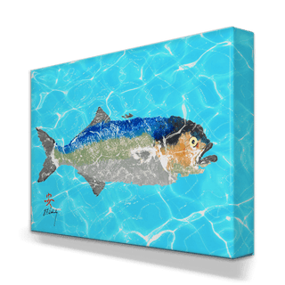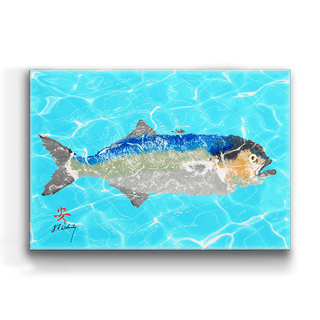 Sweep into the current with this stunning solo depiction that captures the essence of a single Bluefish with a mesmerizing liquid finish that makes the water's surface dance with light. This FishAye Trading piece is a celebration of the solitary grace of one of the ocean's swift navigators.