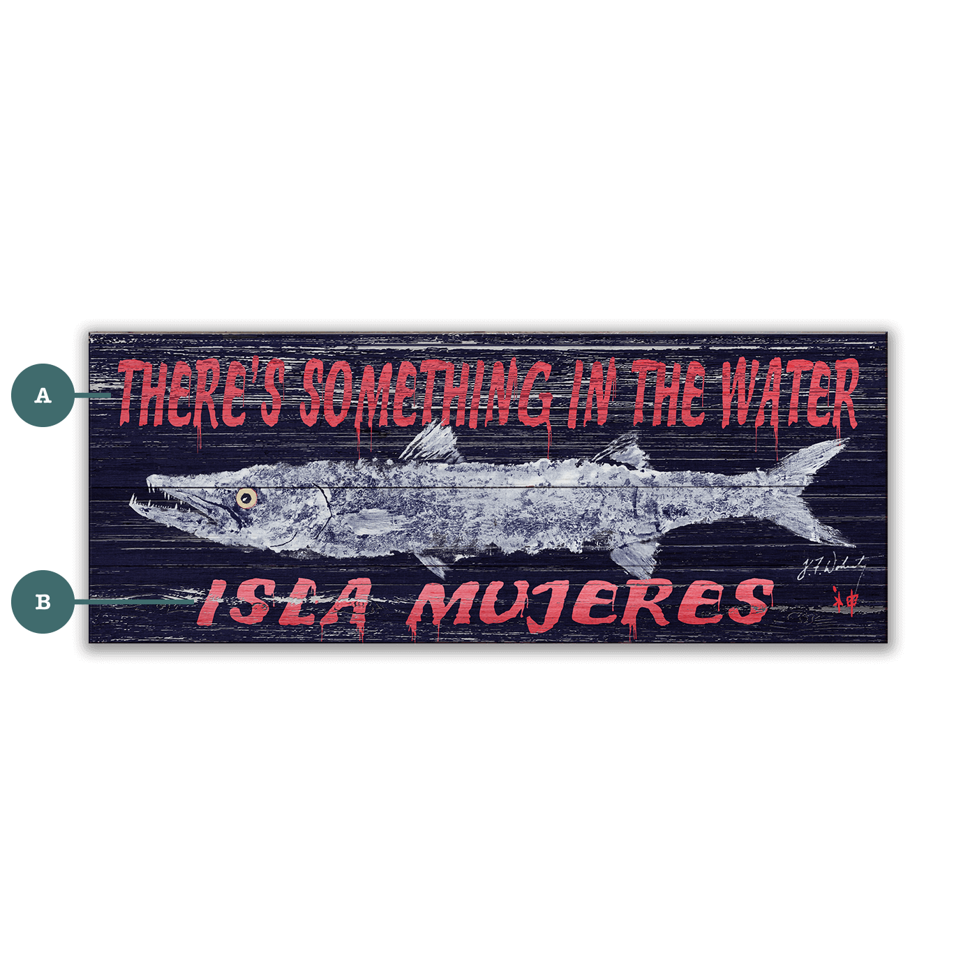Uncover the mysteries of the deep with this striking artwork featuring a barracuda, synonymous with the untamed beauty of Isla Mujeres. This evocative piece, part of FishAye Trading's celebrated collection, harnesses the ancient art of Gyotaku to vividly portray the sleek menace and beauty of the barracuda. Set against a dark, weathered backdrop that suggests the depths of the ocean, the artwork is a compelling tribute to the creatures that lurk beneath the waves. Perfect for adding a touch of intrigue to any coastal-inspired space, this print is a must-have for those drawn to the ocean's hidden wonders.