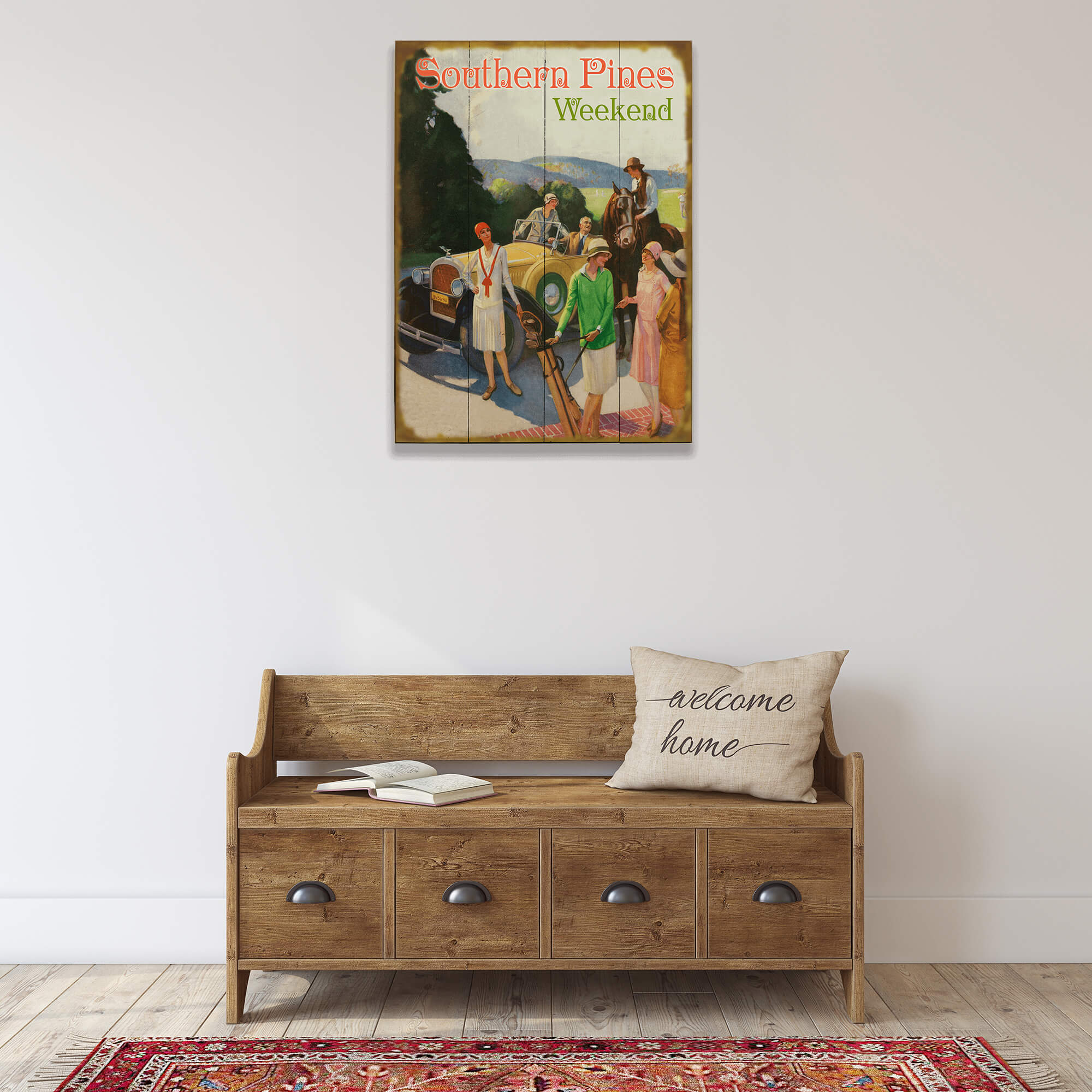 This lively vintage artwork, "Southern Pines Weekend," captures the essence of leisure and recreation in the early 20th century. Featuring an elegantly dressed group of individuals ready to enjoy a weekend of varied activities, from golfing to horseback riding, the artwork vividly portrays the blend of social interaction and outdoor enjoyment. The scene is set against a backdrop of classic cars and scenic landscapes, reflecting the luxury and leisure pursuits of the time. With its rich colors and dynamic composition, this piece is perfect for those who appreciate the charm of vintage leisure lifestyle art and offers a nostalgic glimpse into past social activities.