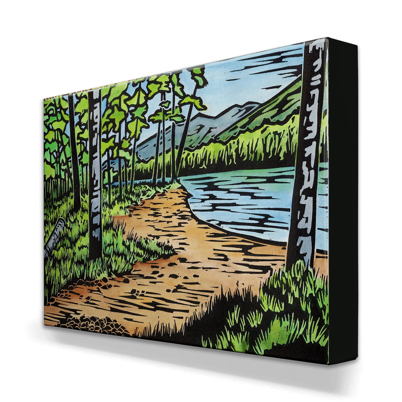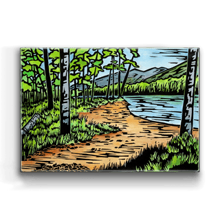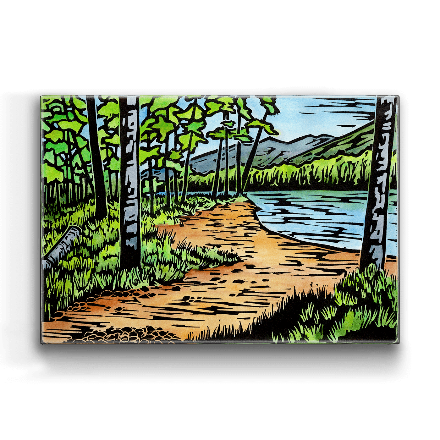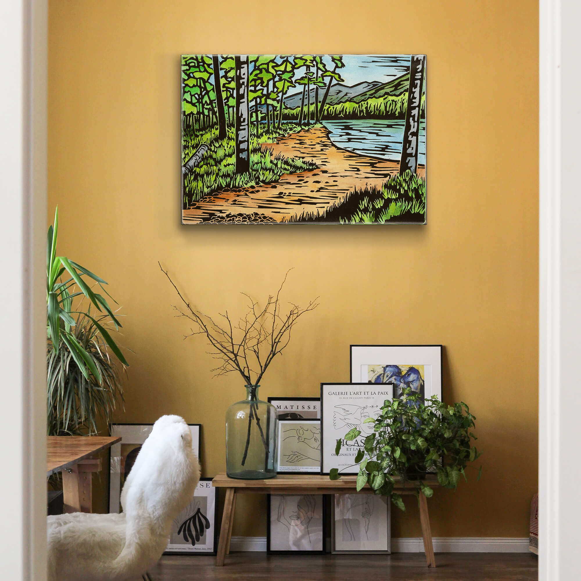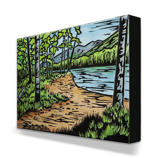With its rich colors and detailed linework, this piece captures the peaceful allure of nature, inviting you to wander along a serene forest path by a sparkling lake, surrounded by lush trees and distant mountains. Perfect for nature lovers and outdoor enthusiasts, this artwork brings the tranquility of a lakeside trail into your space, offering a daily reminder of the beauty found in quiet, natural landscapes.