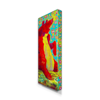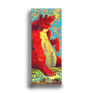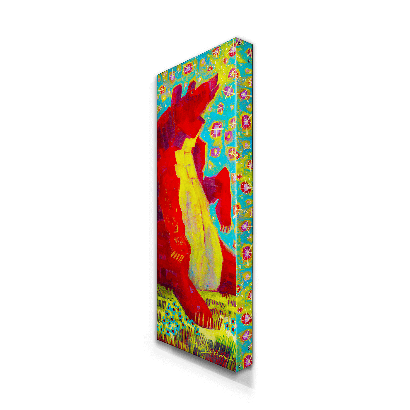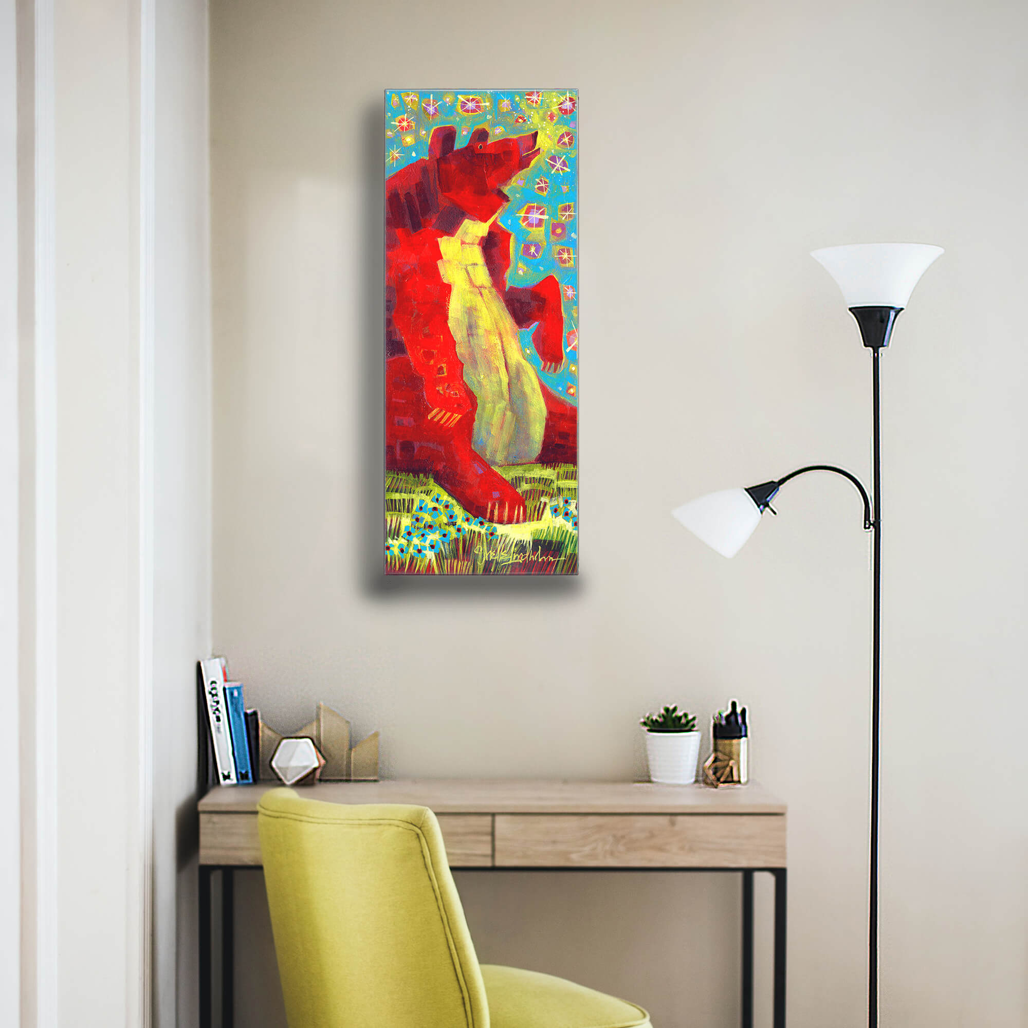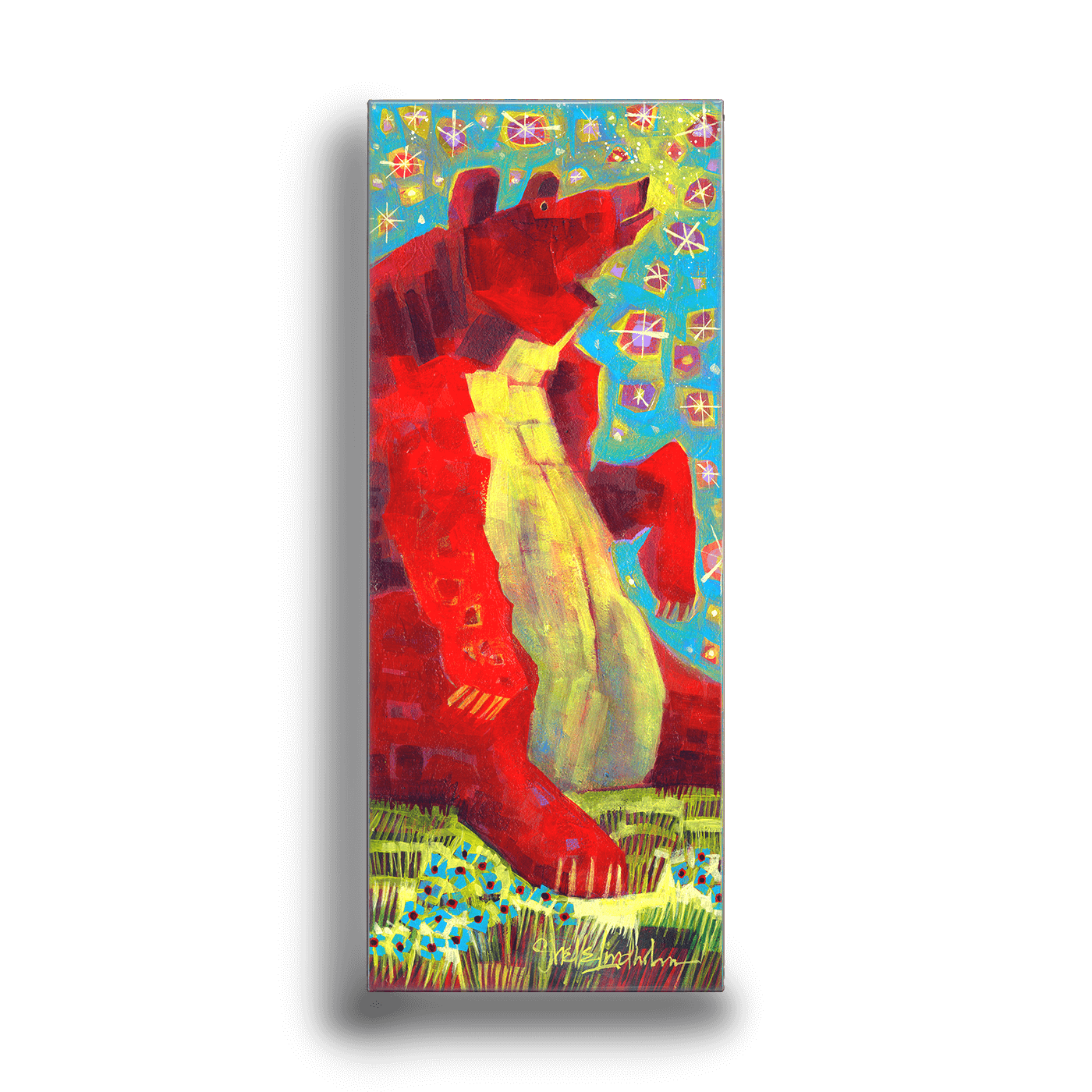 Celebrate the charm of the wilderness with this vibrant artwork of a red bear basking in a star-filled sky. The bold, textured red tones of the bear contrast beautifully with the cool turquoise background adorned with colorful geometric stars. The dynamic composition radiates warmth and wonder, capturing a whimsical moment in nature. Perfect for wildlife enthusiasts and those who enjoy creative modern art, this piece adds a bold and imaginative touch to any space.