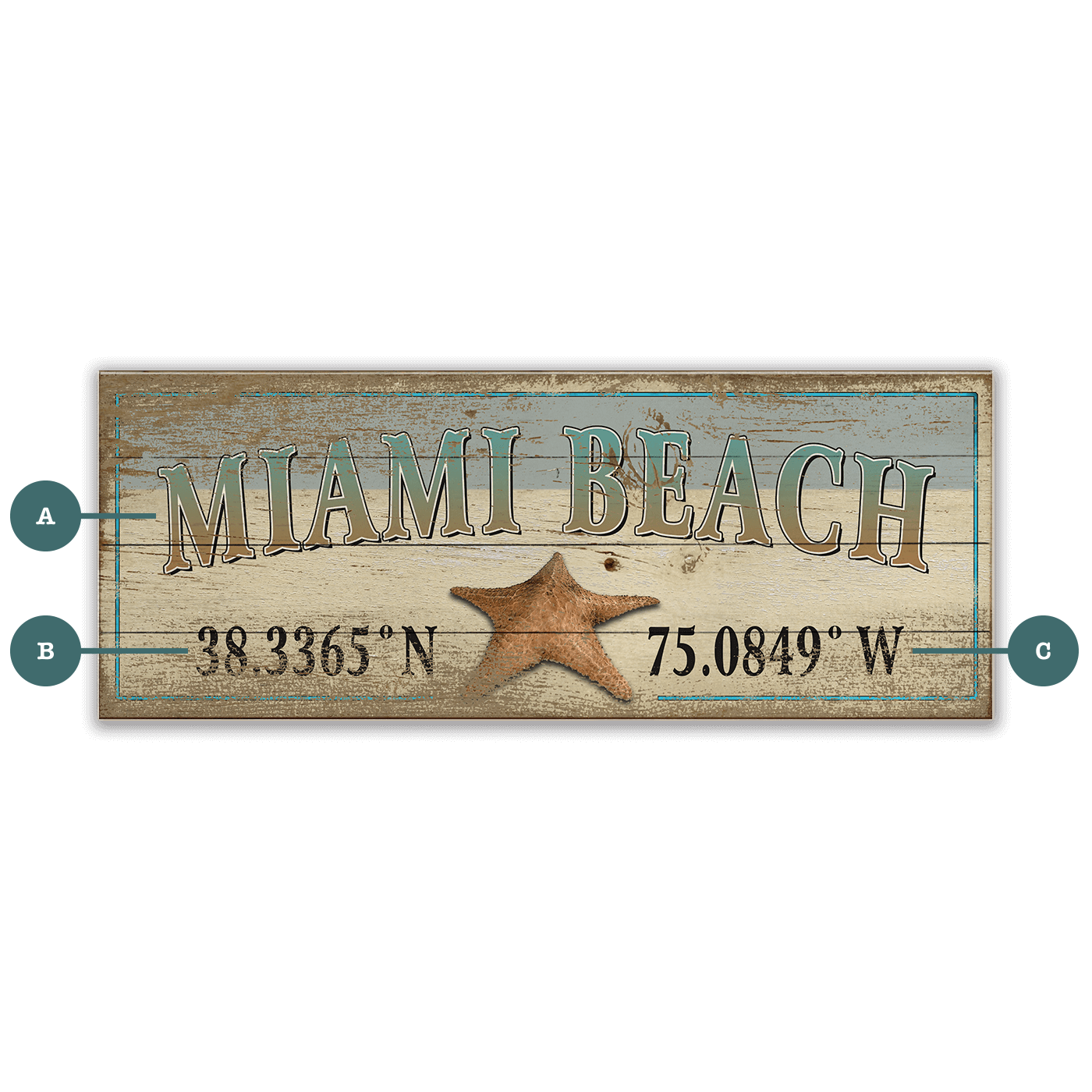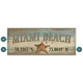 This rustic coastal artwork features a vintage-style beach sign with a starfish accent and nautical coordinates, adding a touch of seaside charm to any space. The distressed wood finish and soft color palette make it an ideal fit for beach-themed décor, coastal cottages, or nautical-inspired rooms. Personalization options are available, allowing you to customize the coordinates for a unique, personal touch.