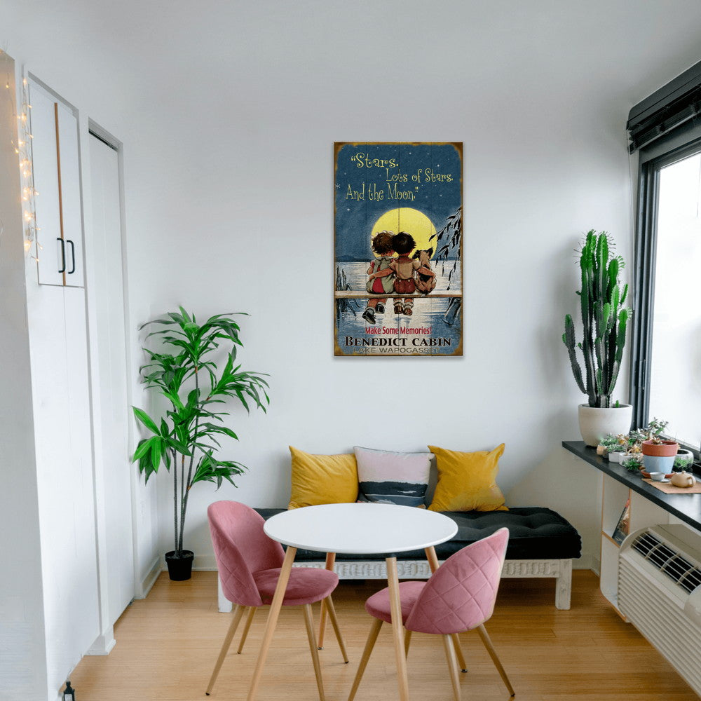 Celebrate the magic of childhood wonder and peaceful nights with this charming sign. Featuring two children and their loyal dog seated on a dock, the artwork captures a tender lakeside moment beneath a glowing full moon. Surrounded by soft reflections on the water and the sparkle of countless stars, the scene invites feelings of nostalgia and serenity. The rustic weathered finish gives it a cozy, timeless appeal—perfect for lake houses, cabins, or any space in need of a sentimental touch. A gentle reminder to “Make Some Memories,” this piece beautifully honors the joy of simple moments shared under the night sky.