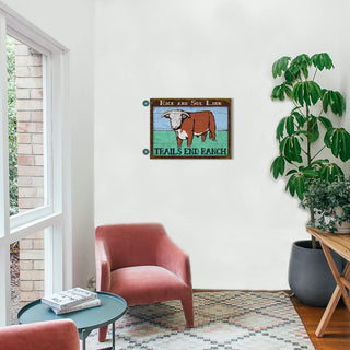 With a bold, rustic charm, this piece showcases a striking depiction of a Hereford cow standing against a serene countryside backdrop. The simple, graphic-style illustration enhances its vintage appeal, while the weathered finish adds a sense of authenticity, making it feel like a well-loved ranch sign. The earthy tones and classic Western typography reinforce its connection to hardworking farm life and cattle ranching traditions. Perfect for barns, ranch houses, or any space that embraces the rugged beauty of rural living.