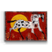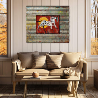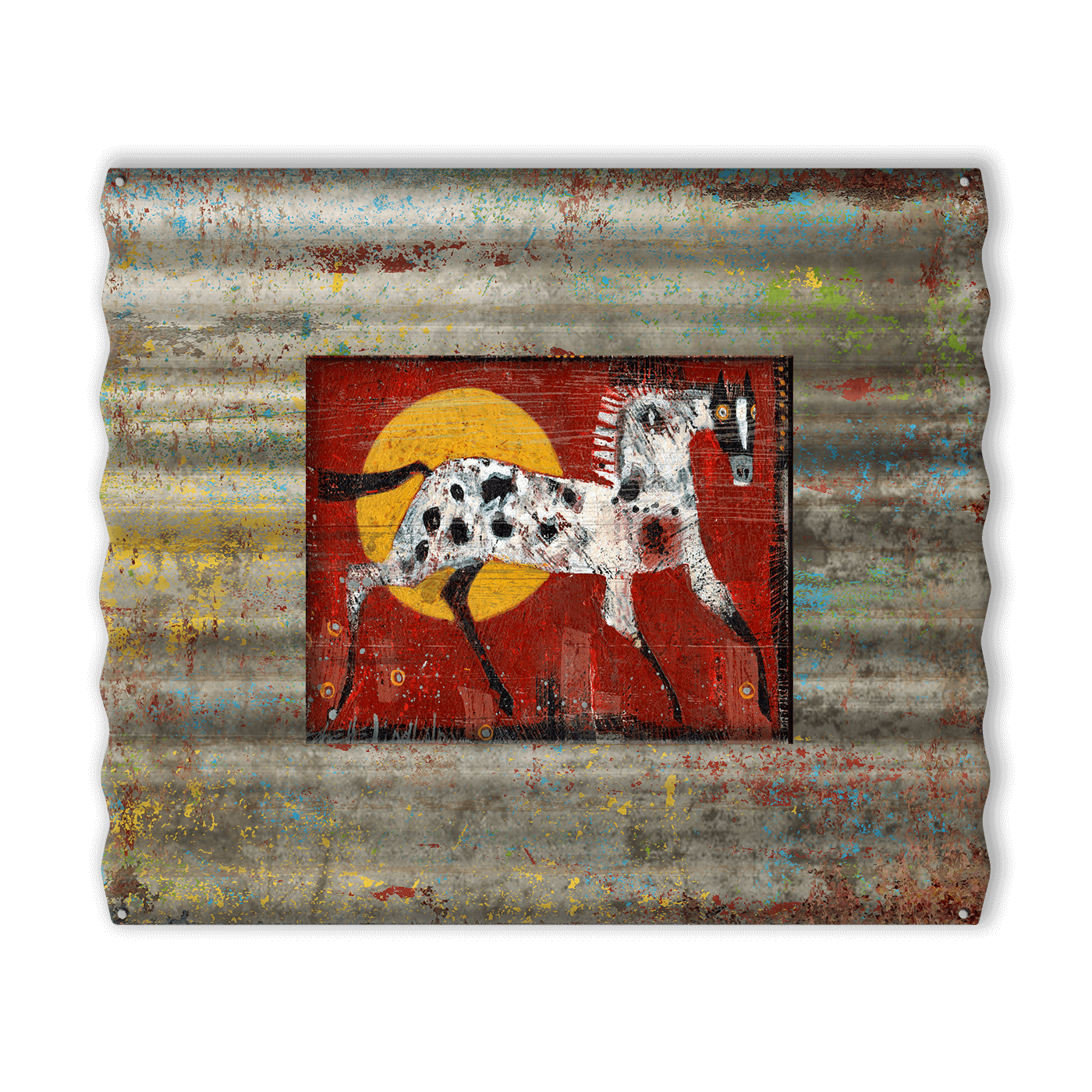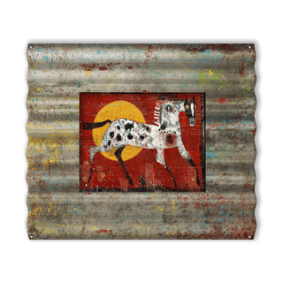 This captivating artwork features an abstract depiction of a horse, set against a bold red background with a striking yellow sun. The horse's dynamic form, accentuated by its speckled coat, creates a sense of movement and energy. Mounted on a weathered, corrugated metal surface, the piece combines rustic elements with modern artistic expression, resulting in a visually powerful and unique statement. Perfect for those who appreciate contemporary art with a rugged, industrial edge, this piece adds character and vibrancy to any space.