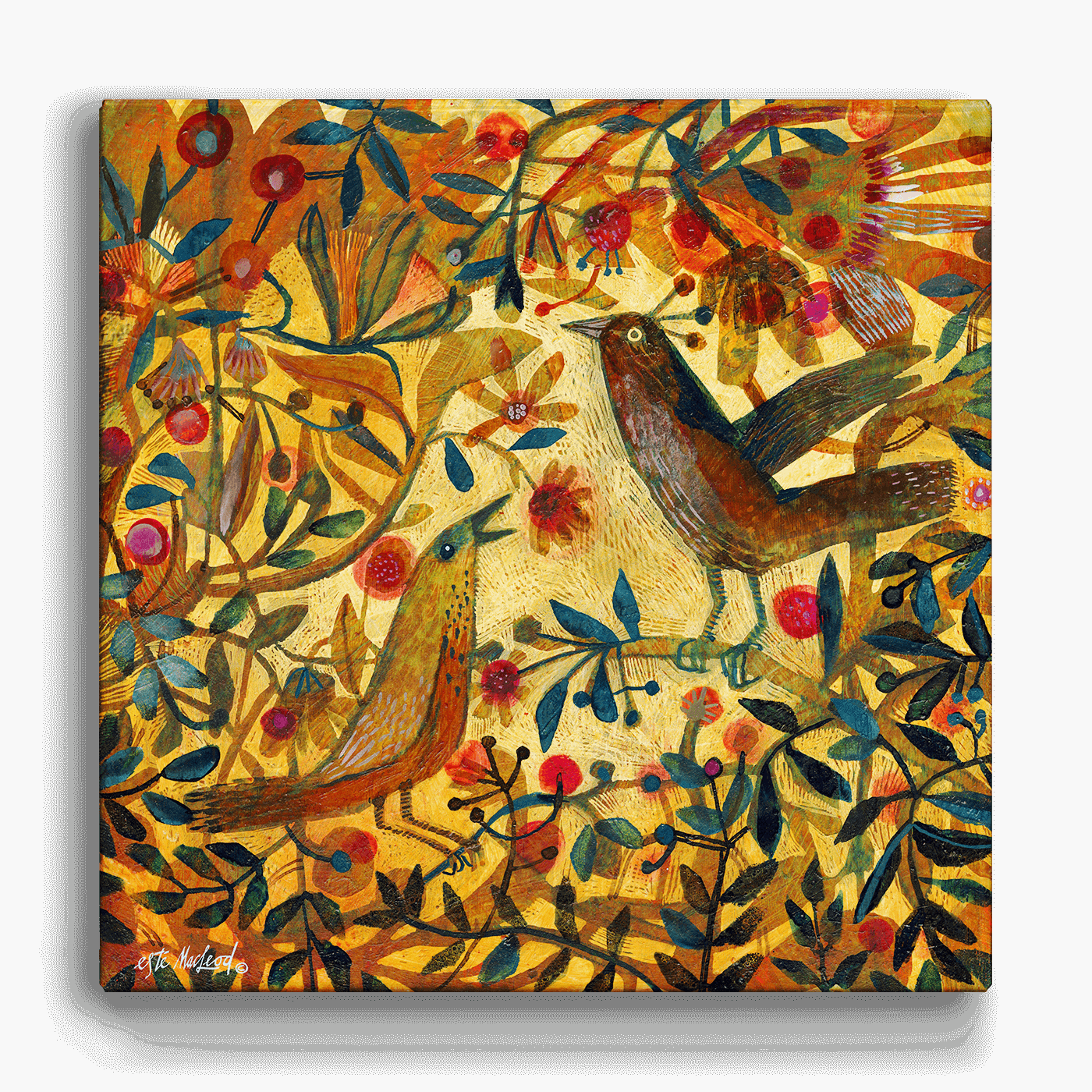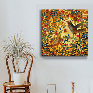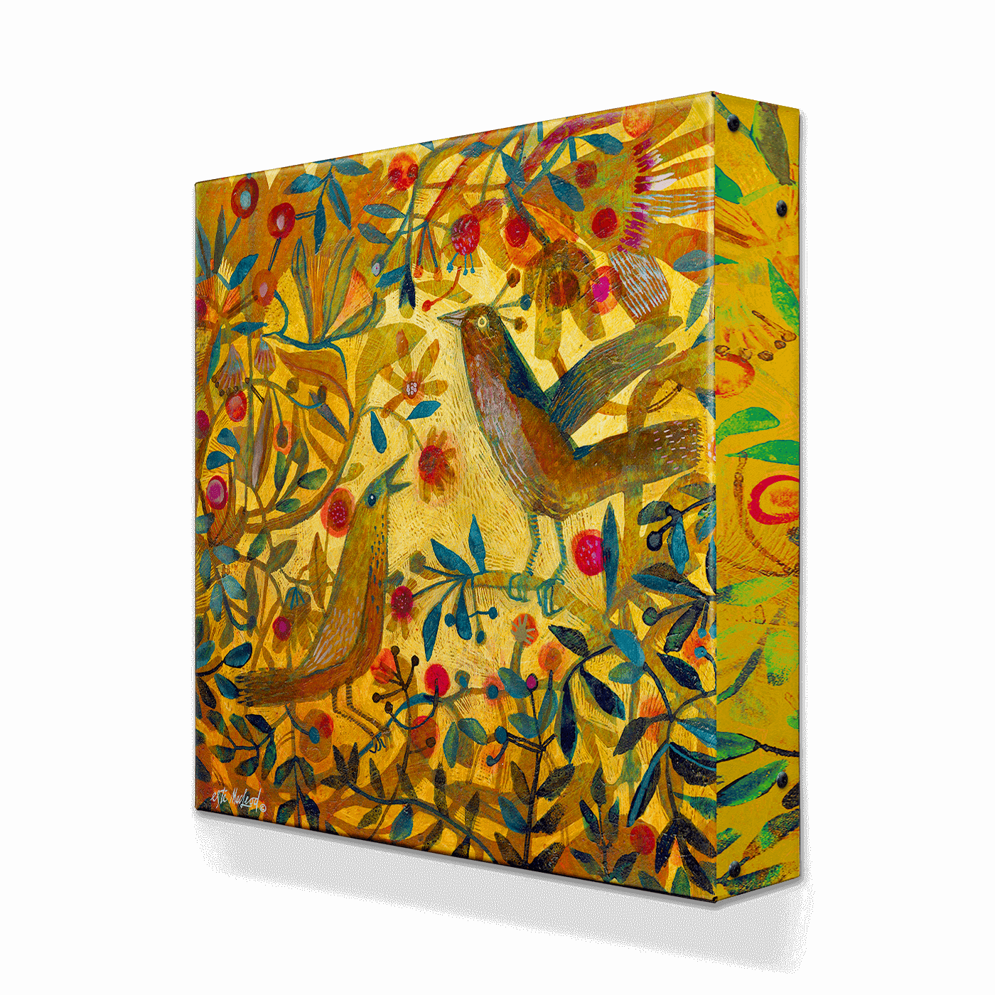Embrace the tranquil beauty of "Sunset Medit" by Este MacLeod, where a chorus of birds serenades the close of day. Printed on a lustrous sheet of aluminum, crafted into a shallow box, this artwork is a window into a whimsical world aglow with the golden hues of dusk. The artist's flair for combining the tangible with the fantastical blooms in this piece, as imaginative patterns and rich textures interlace with the simple silhouettes of birds and botanicals.