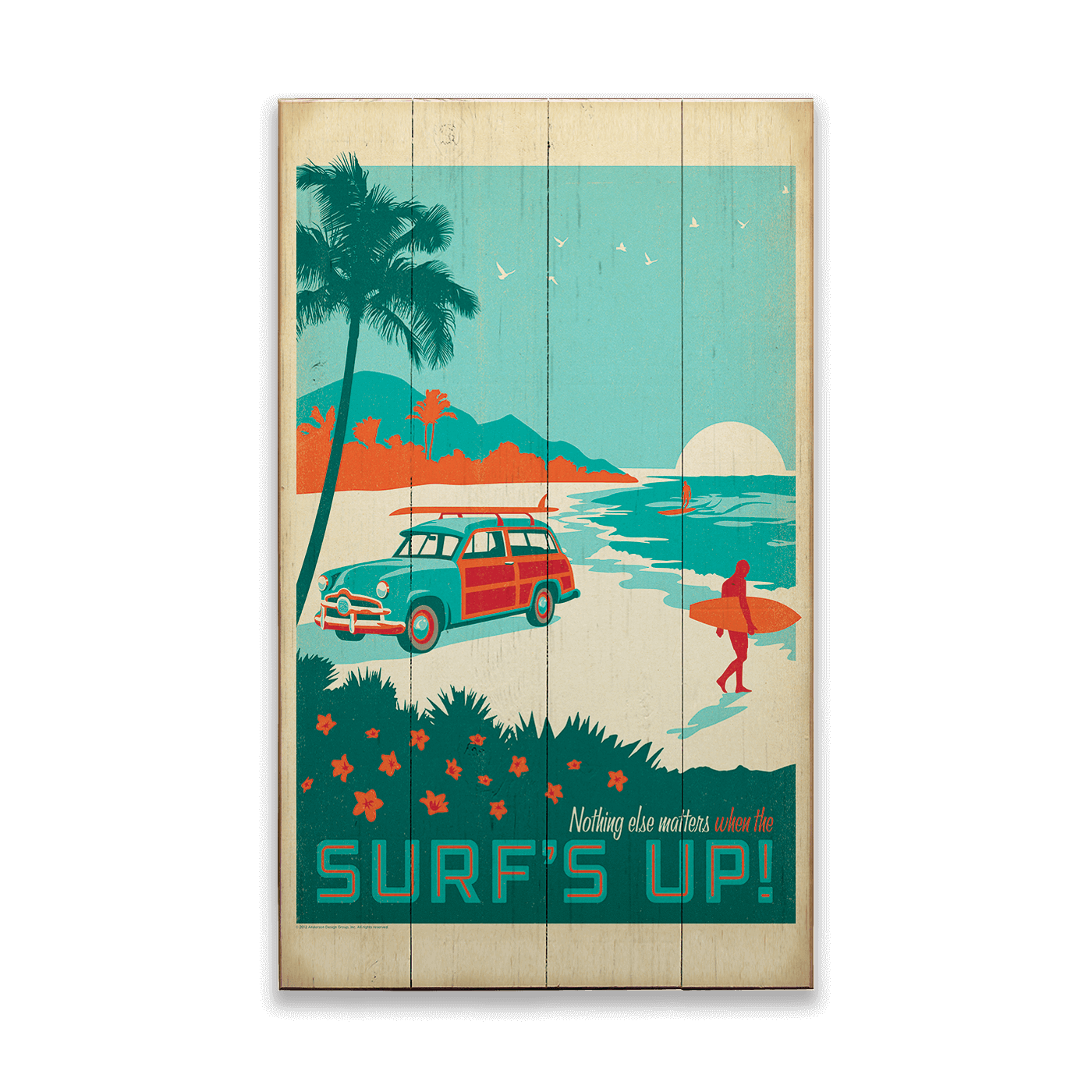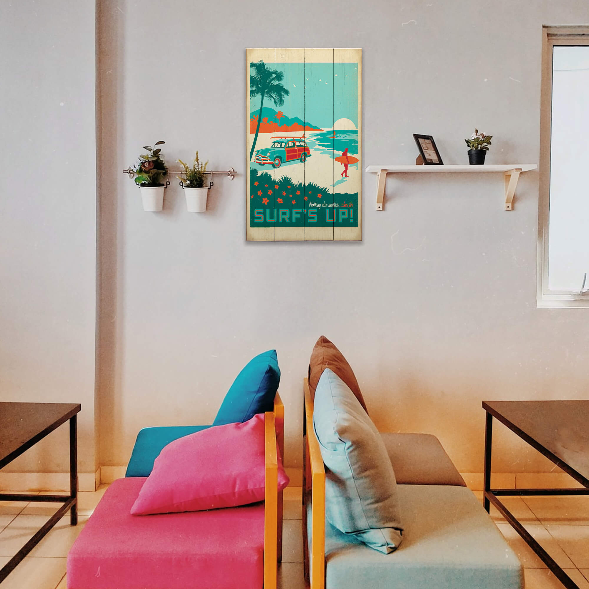 Ride the wave of nostalgia with this retro-inspired "Surf's Up!" artwork. Capturing the laid-back surf culture of your favorite beach, this artwork features a classic woodie station wagon, palm trees, and a surfer against a backdrop of a serene sunset. It’s perfect for surf enthusiasts, beach lovers, or anyone looking to add a splash of vintage coastal charm to their decor.