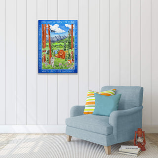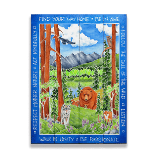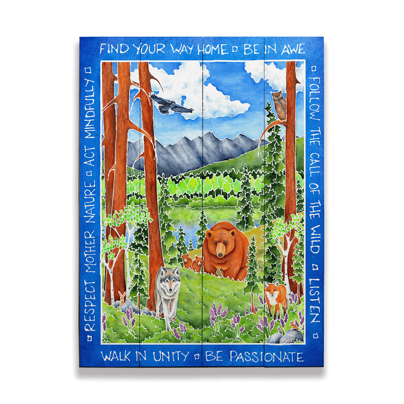 Add a touch of natural serenity and inspiration to your space with this beautiful portrayal of the spirit of the forest as wildlife gather peacefully among tall trees, with majestic mountains and a clear blue sky in the background. Surrounded by messages of unity, mindfulness, and respect for nature, this piece is perfect for nature enthusiasts and those inspired by the call of the wild.