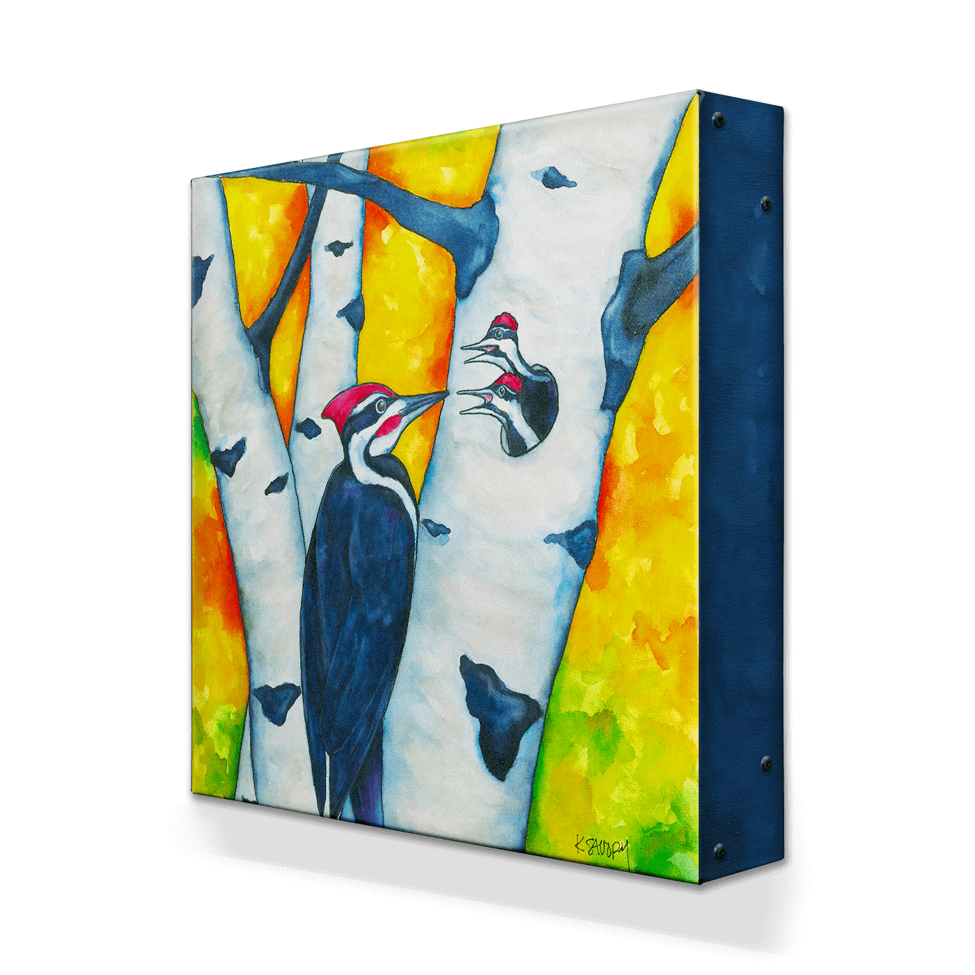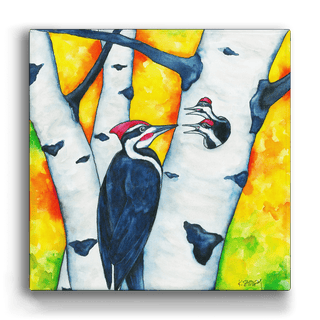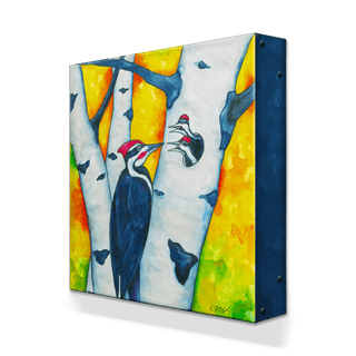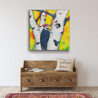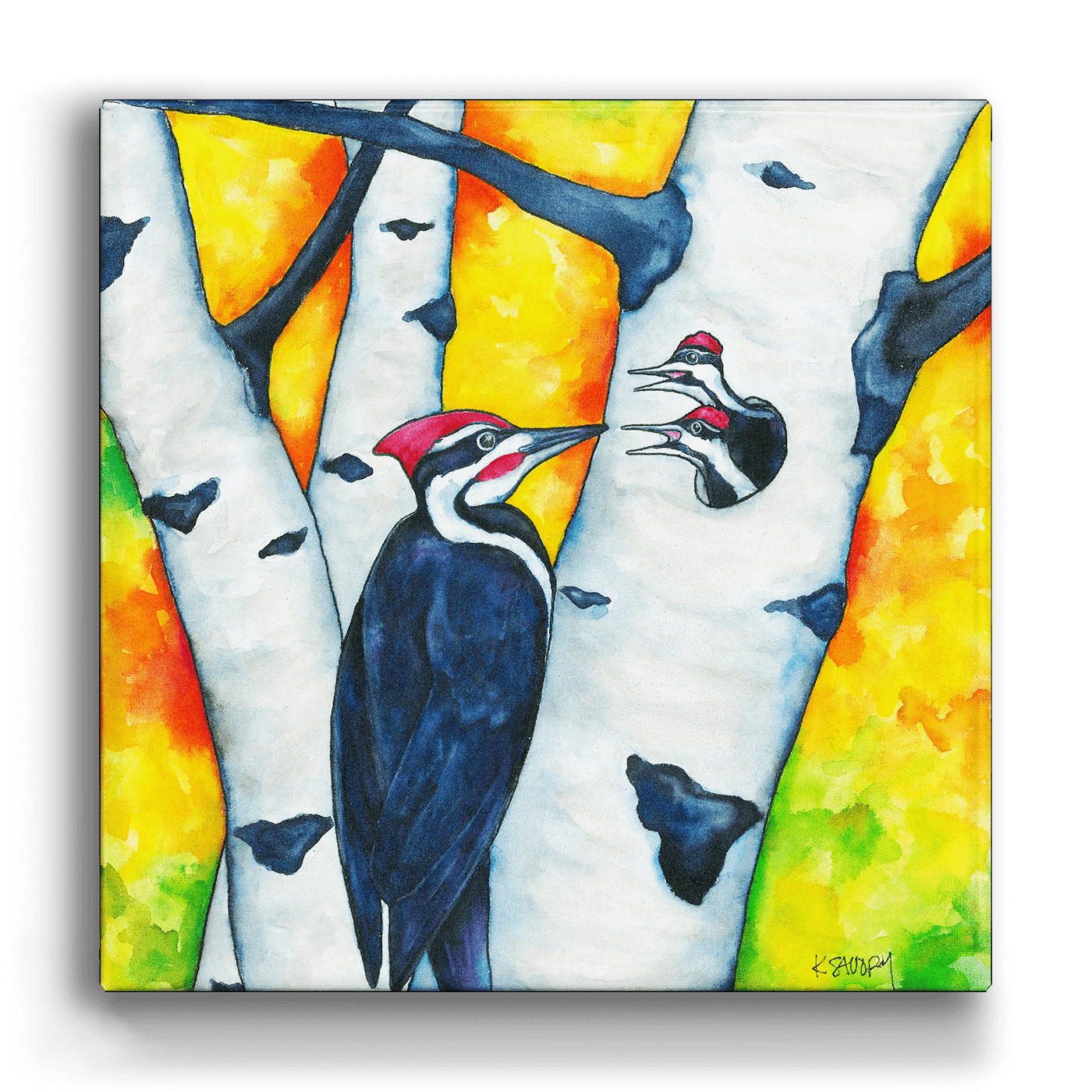 This lively artwork beautifully captures a family of woodpeckers among aspen trees, bringing the nurturing energy of nature into focus. The striking red crests of the woodpeckers stand out against the cool whites of the aspen bark and the fiery yellow and orange background, evoking the warmth of a sunny autumn day. The detailed illustration of the adult woodpecker feeding its young creates a dynamic scene perfect for nature lovers and bird enthusiasts looking to add a burst of color and wildlife charm to any home or office space.