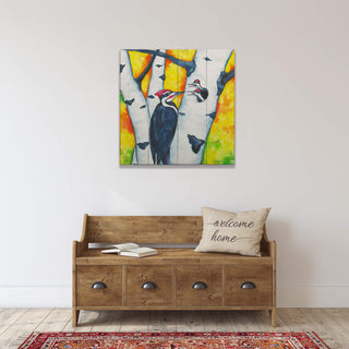 This lively artwork beautifully captures a family of woodpeckers among aspen trees, bringing the nurturing energy of nature into focus. The striking red crests of the woodpeckers stand out against the cool whites of the aspen bark and the fiery yellow and orange background, evoking the warmth of a sunny autumn day. The detailed illustration of the adult woodpecker feeding its young creates a dynamic scene perfect for nature lovers and bird enthusiasts looking to add a burst of color and wildlife charm to any home or office space.