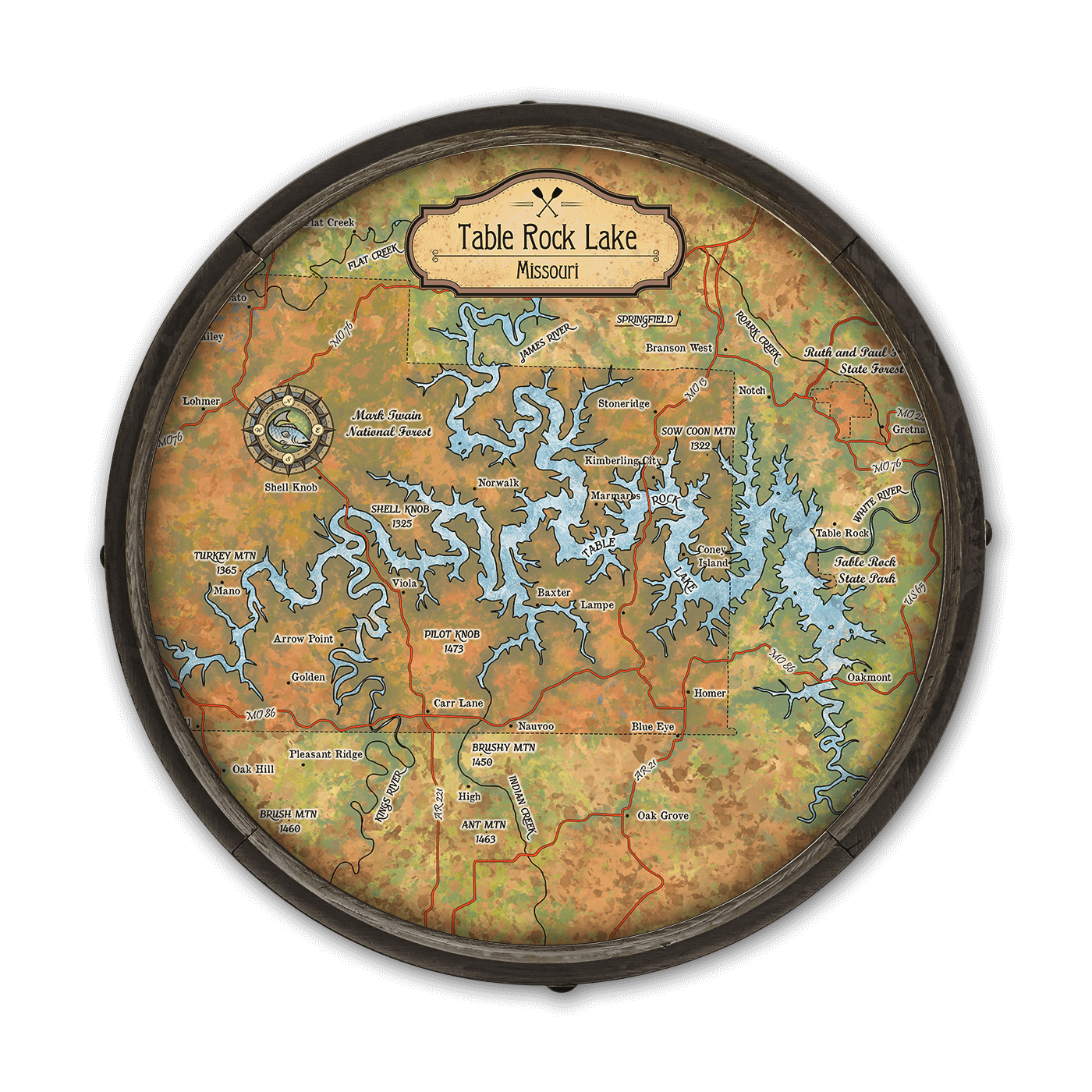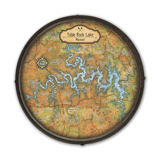 Discover the stunning beauty of Table Rock Lake with our handcrafted decorative map. This unique piece of art showcases the stunning 800 miles of shoreline surrounded by lush forests and wildlife in the heart of Missouri's Ozark Mountains. Often referred to as 'Tablerock', Table Rock Lake is one of the top fishing spots in the nation, known for its calm waters and diverse fish species and perfect for nature lovers and fishing enthusiasts. Whether you're a local or just looking for your next lake adventure, our map will bring a touch of the outdoors into your home.