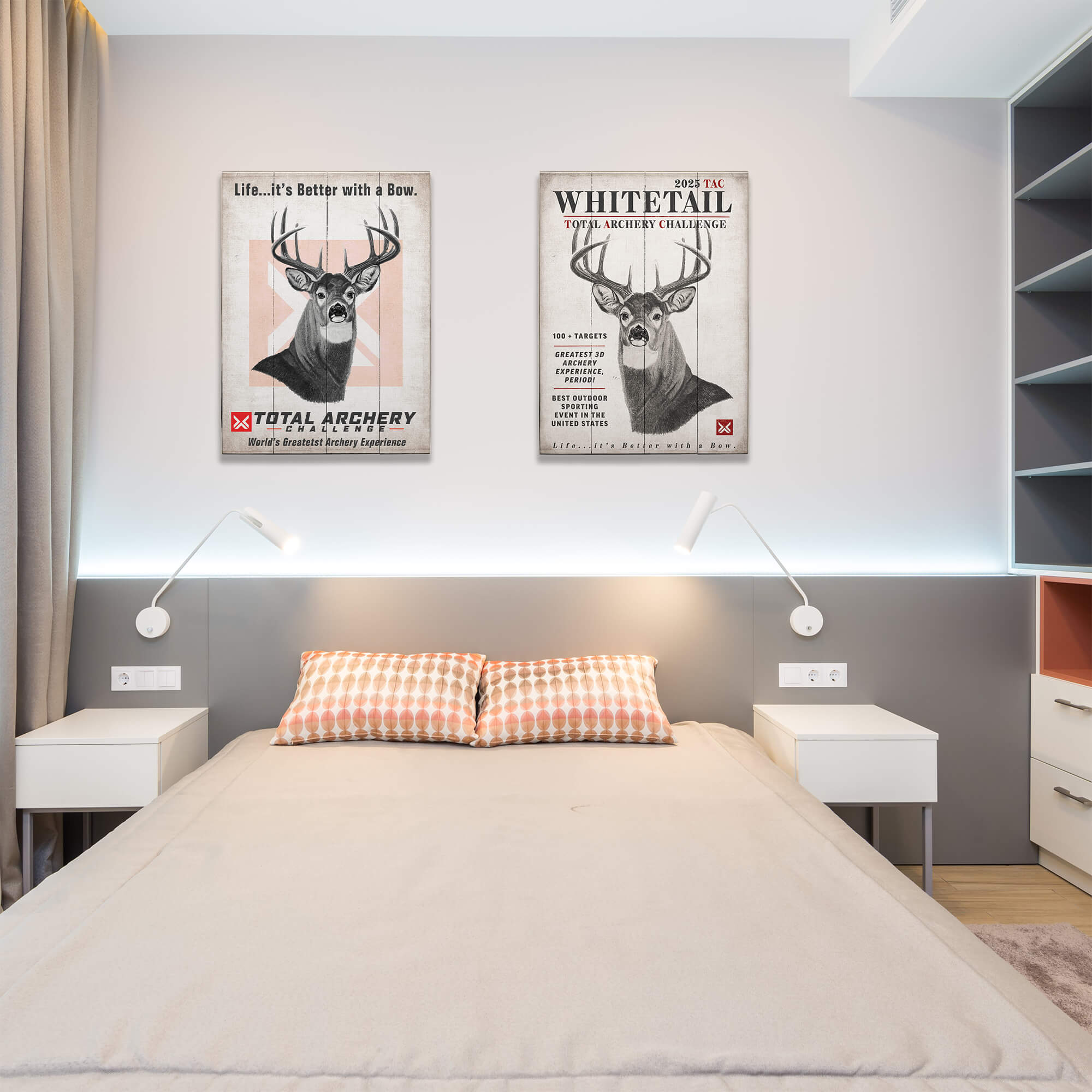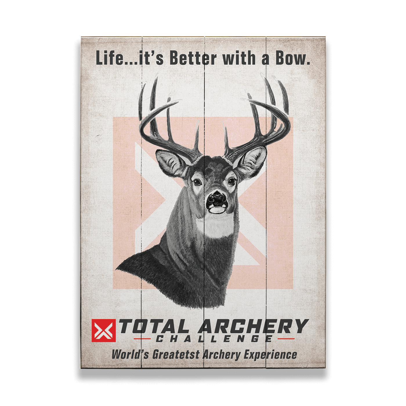 Show your passion for bowhunting and precision archery with this bold Total Archery Challenge wall art. Featuring a powerful whitetail buck illustration set against the signature TAC emblem, this piece celebrates the thrill of drawing a bow and mastering the shot. With its rugged design and rallying message—"Life… it’s Better with a Bow"—this artwork is a standout addition for home ranges, bow shops, hunting camps, or any space where archers and hunters gather. A perfect way to mark your connection to the world’s greatest archery experience.